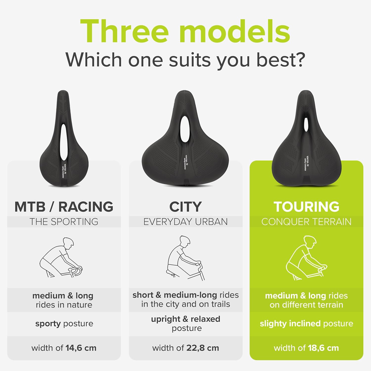- MADE FOR YOUR RIDING POSITION - There are three specific models of the bicycle saddle, so you can choose the Velmia bike seat depending on your individual riding position and riding style needs!