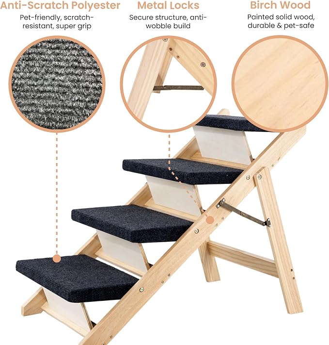 - 1. Adjustable 3-in-1 Ramp & Stairs Easily switch between stair and ramp mode to suit your pet’s needs. Whether for aging joints or tiny paws, our 3-in-1 foldable design (Stair / Ramp / Storage) ensures safe and comfy climbs.