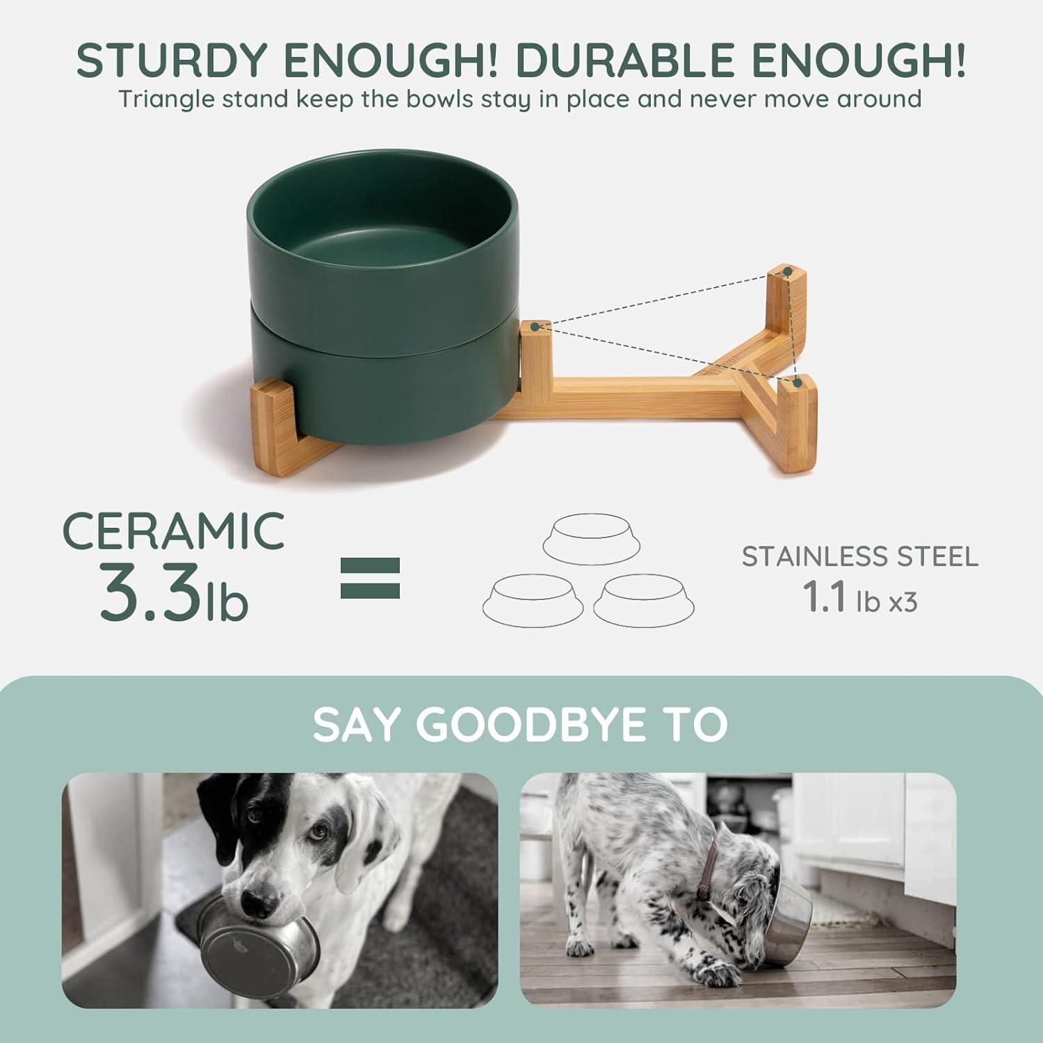 SPUNKYJUNKY Ceramic Dog and Cat Bowl with Wood Stand Non-Slip Matte Glaze Weighted Food Water Set for Cats &Small Dogs 13.5 OZ Green