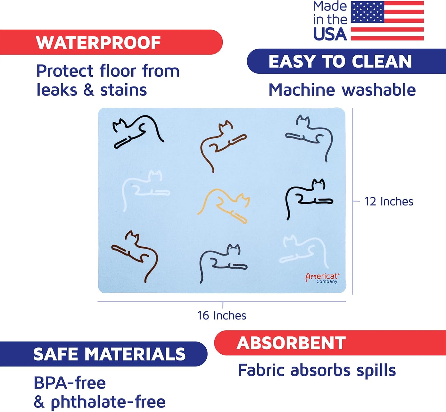 Cat Feeding Mat by Americat for Cat Food & Water Bowls – Machine Washable, Waterproof, No-Slip & Made in USA Cat Placemat – Protect Floors from Messy Eaters & Drinkers – 16 x 12 Inches (Cats)
