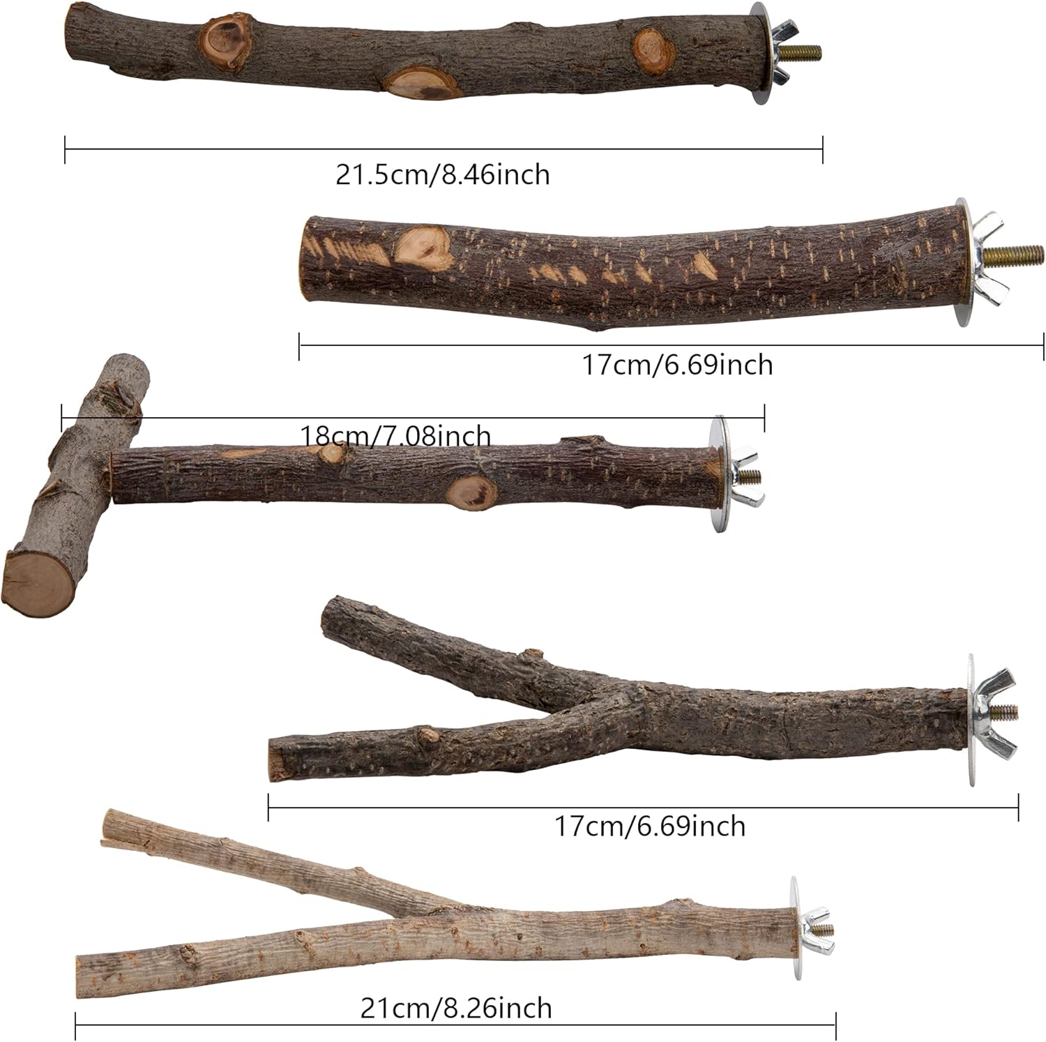 - Dimension: The length of 2 branch perches measures about 6.69 inch and 8.26 inch respectively, the 2 wooden perches measures about 6.69 inch and 8.46 inch respectively and the T shaped perch measures 7.08 inch.