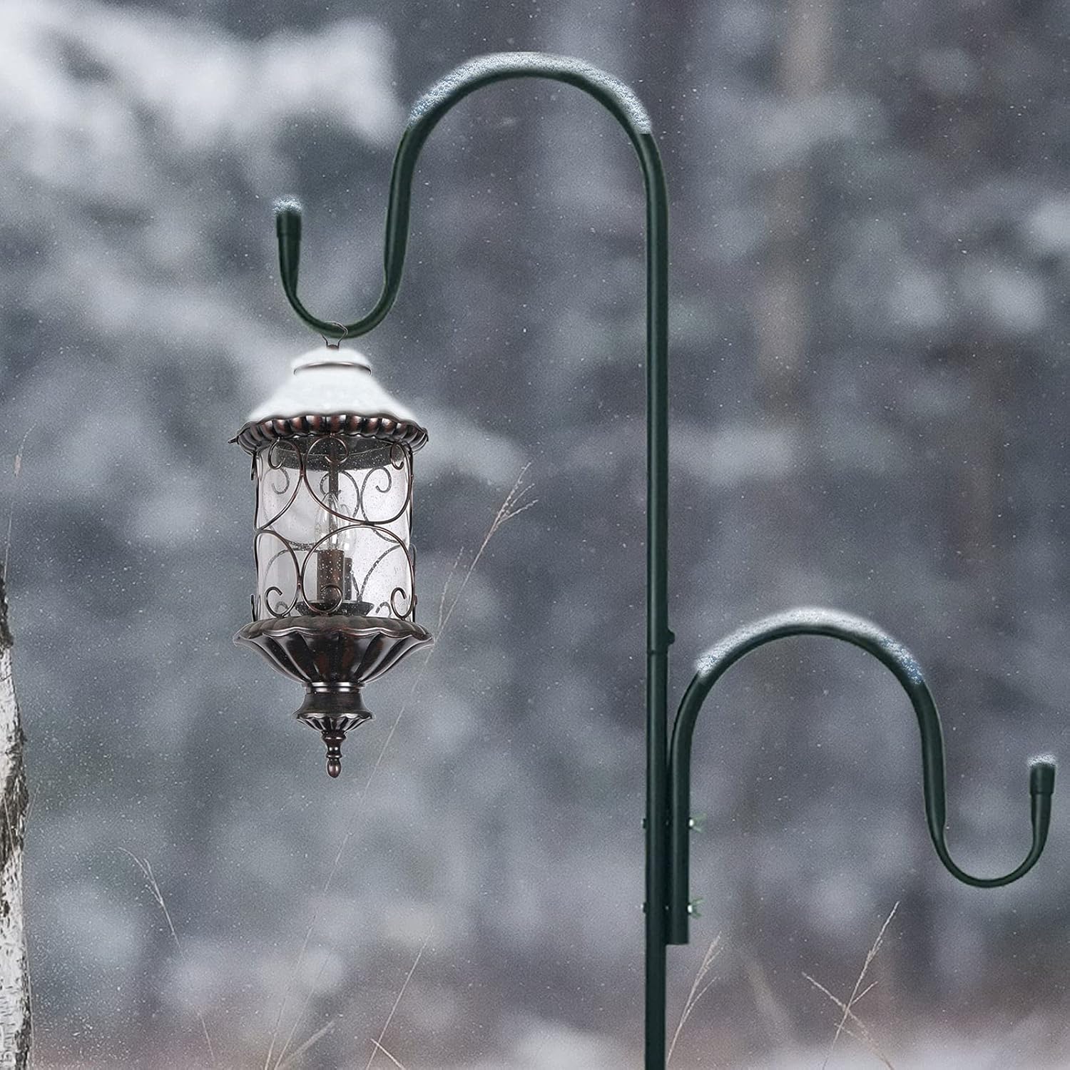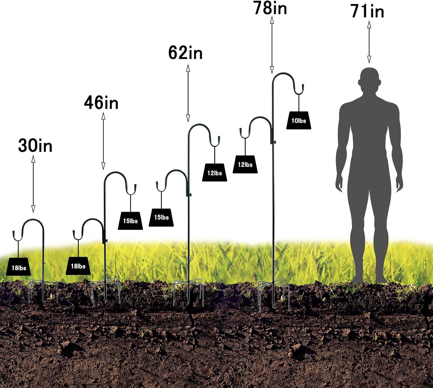 - 【STURDY & DURABLE】 With a 3/4 inch diameter wrought iron metal garden hanging hooks, At a height of 30", each hook is suitable weight that no more than 15lbs; 46" in height fits no more than 12lbs;62" in height fits no more than 10lbs;78"in height fits no more than 8lbs.(NO OVERLOADING) Tip: On both hooks Hanging items makes it easier to balance.The 5 base prongs must all be plugged into the lawn to be provide better stability.