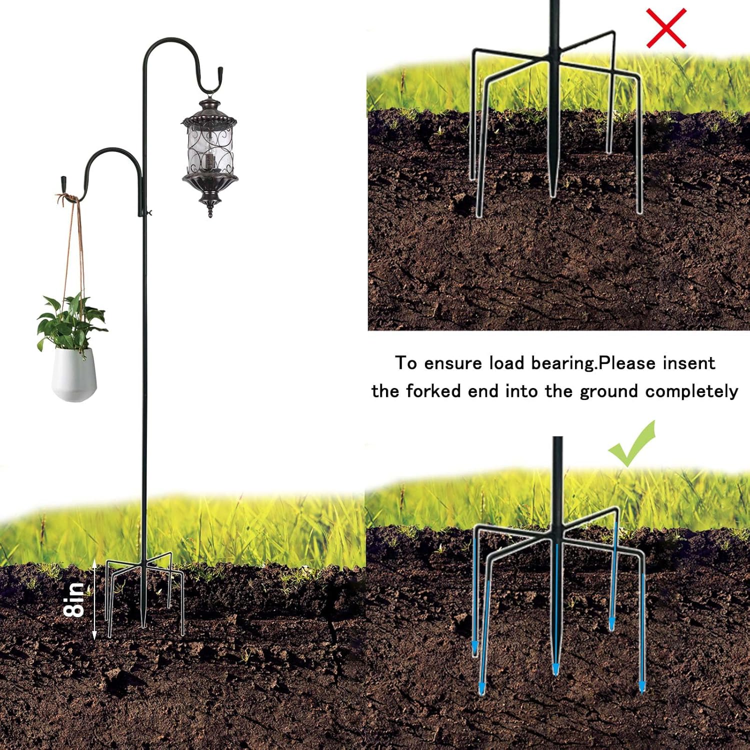 - 【NOTES】 We don’t recommend putting these metal hook hangers into soft moist soil or hanging overloads, which may cause the hook to tip over or bend down. If you have any questions about quality during use, please feel at ease to contact us.
