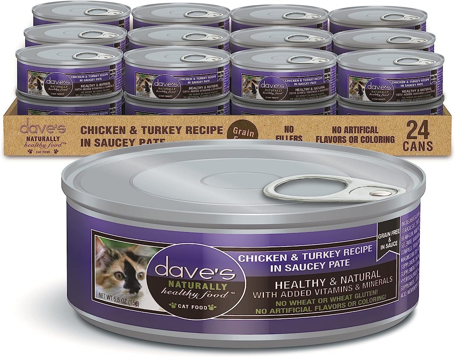 Dave's Pet Food Grain Free Wet Cat Food (Chicken & Turkey Saucey Pate), Naturally Healthy Canned Cat Food, Added Vitamins & Minerals, Wheat Free, 5.5 oz (24 Pack)