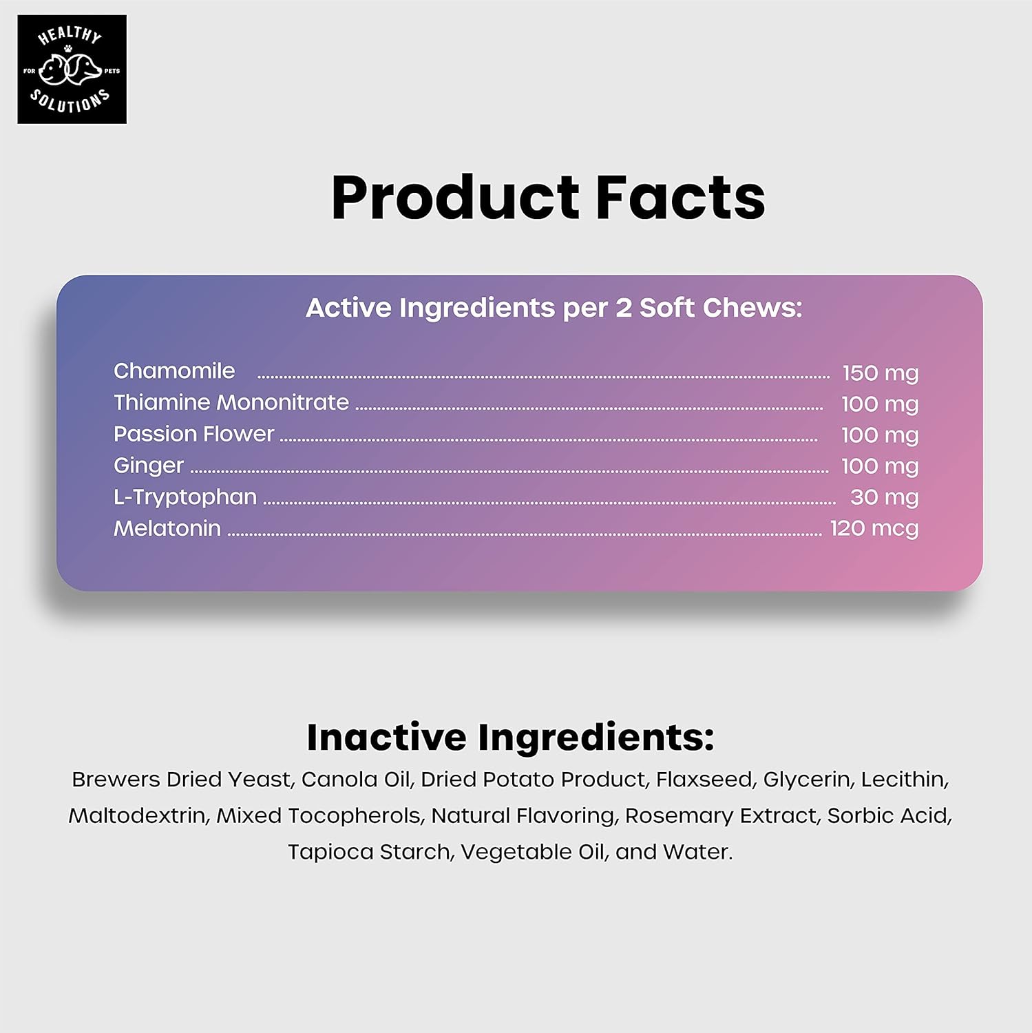 - 🗸 VETERINARIAN FORMULATED -- with Melatonin, Chamomile, Passion Flower, Thiamine, L-Tryptophan, and Ginger to help soothe sensitive stomaches.