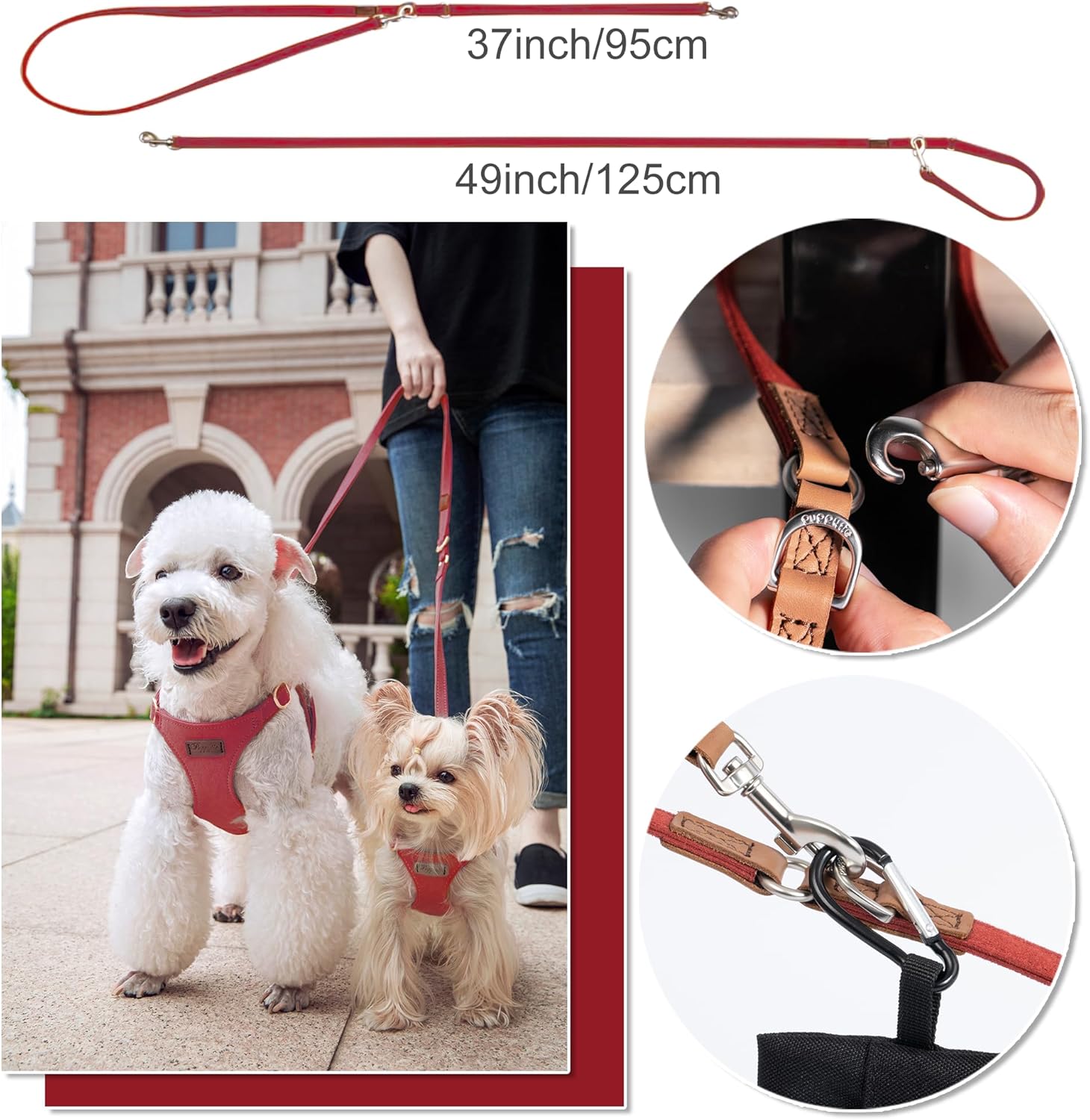- Dog leash:Puppytie’s dog harness is equipped with a multi-functional leash, which can be adjusted in two lengths of 49inch and 37inch. You can use it to easily carry two dogs out. It has the function of carrying keys or garbage bags. The function of wait in place allows dogs to wait in place quickly and safely
