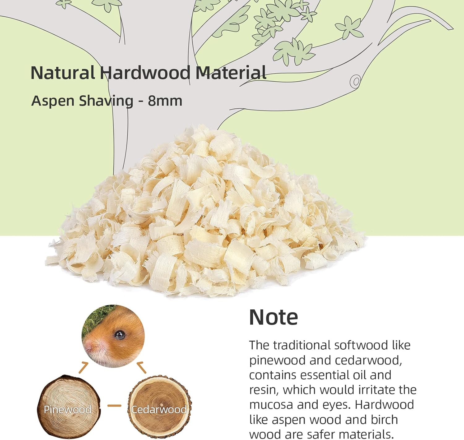 - [Strong Absorption & Easy Clean] The aspen bedding can help absorb annoying smells and soak up moisture really well. It freshens the air of your pets' hideout. They have strong water absorption. With Aspen wood bedding, it is such a time saver. If your pet has a designated spot he or she prefers to do their business, you can scoop that spot and refill that area easily.