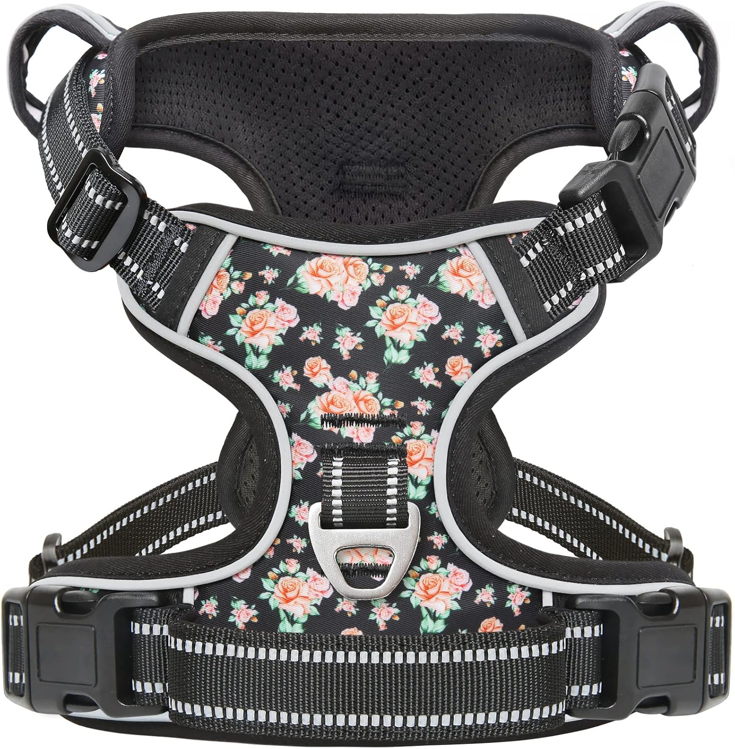 Timos Dog Harness, 3 Snap Buckles No-Pull Soft Padded Dog Vest with 2 Metal Leash Clips,Adjustable Reflective No Choke Pet Harness with Easy Control Handle for Small Dogs,Black Rose,S