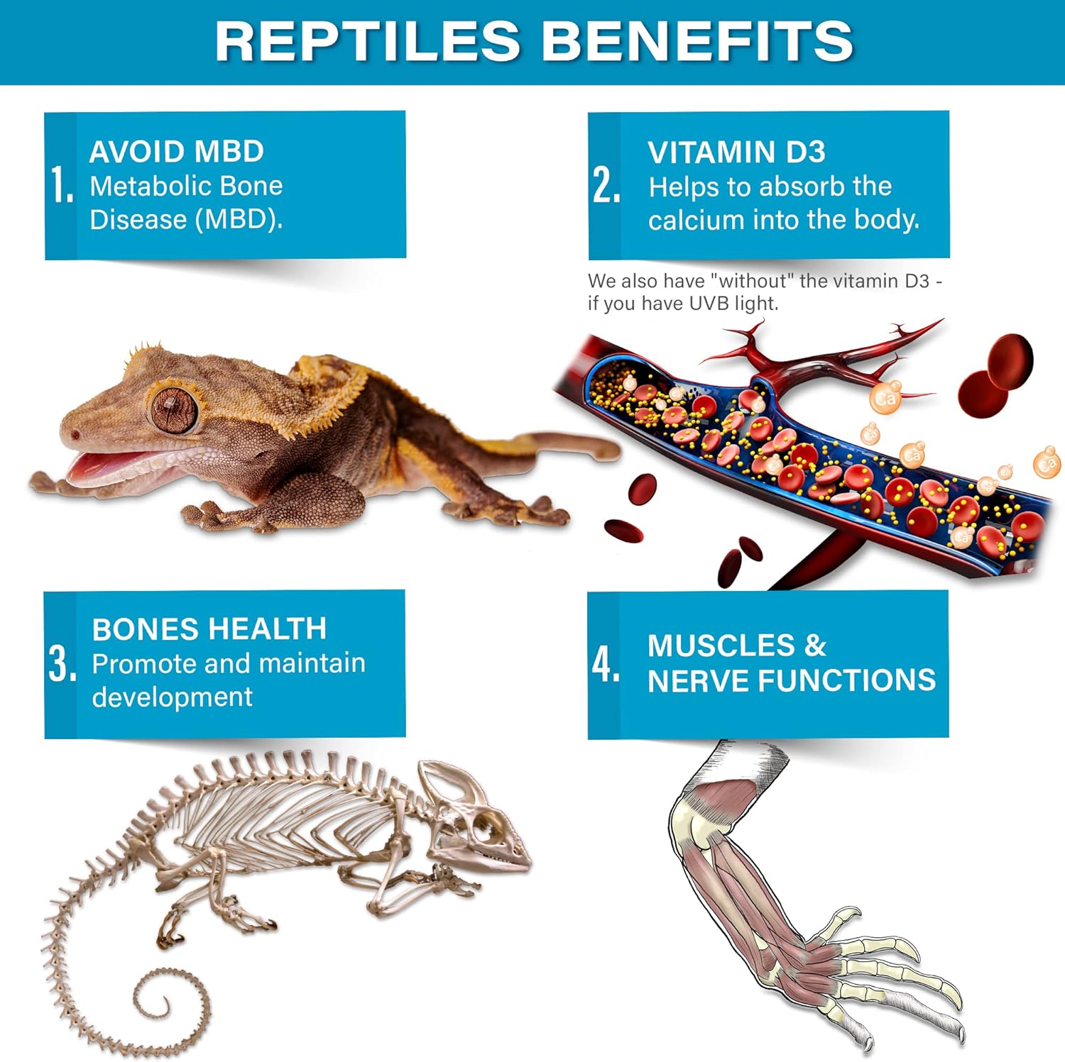 - ESSENTIAL. Let’s help your reptiles and amphibians to stay healthy and prosper! Calcium deficiency in reptiles is a major contributing factor in Metabolic Bone Disease (MBD). Gargeer’s All Reptile Calcium Powder serves as a perfect supplement for all reptiles & amphibians in captivity, aimed to promote and maintain bones, muscles, and nerve functions.