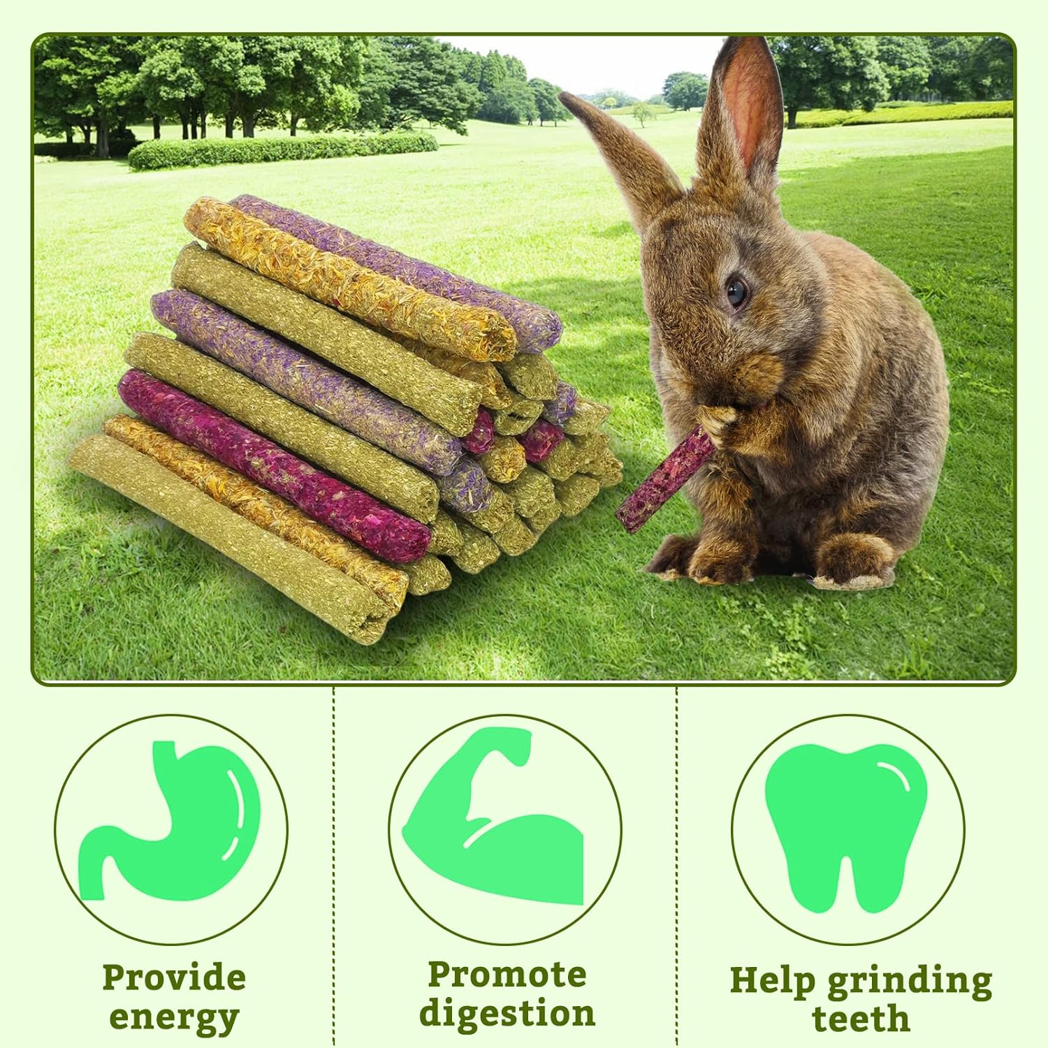 - 🐰 [Interaction & Teeth Grinding]: Timothy hay sticks are suitable for hand feeding, making your relationship with your pet more intimate during interactions with your pet, and can also relieves overgrowth of rodent teeth, anxiety and boredom.