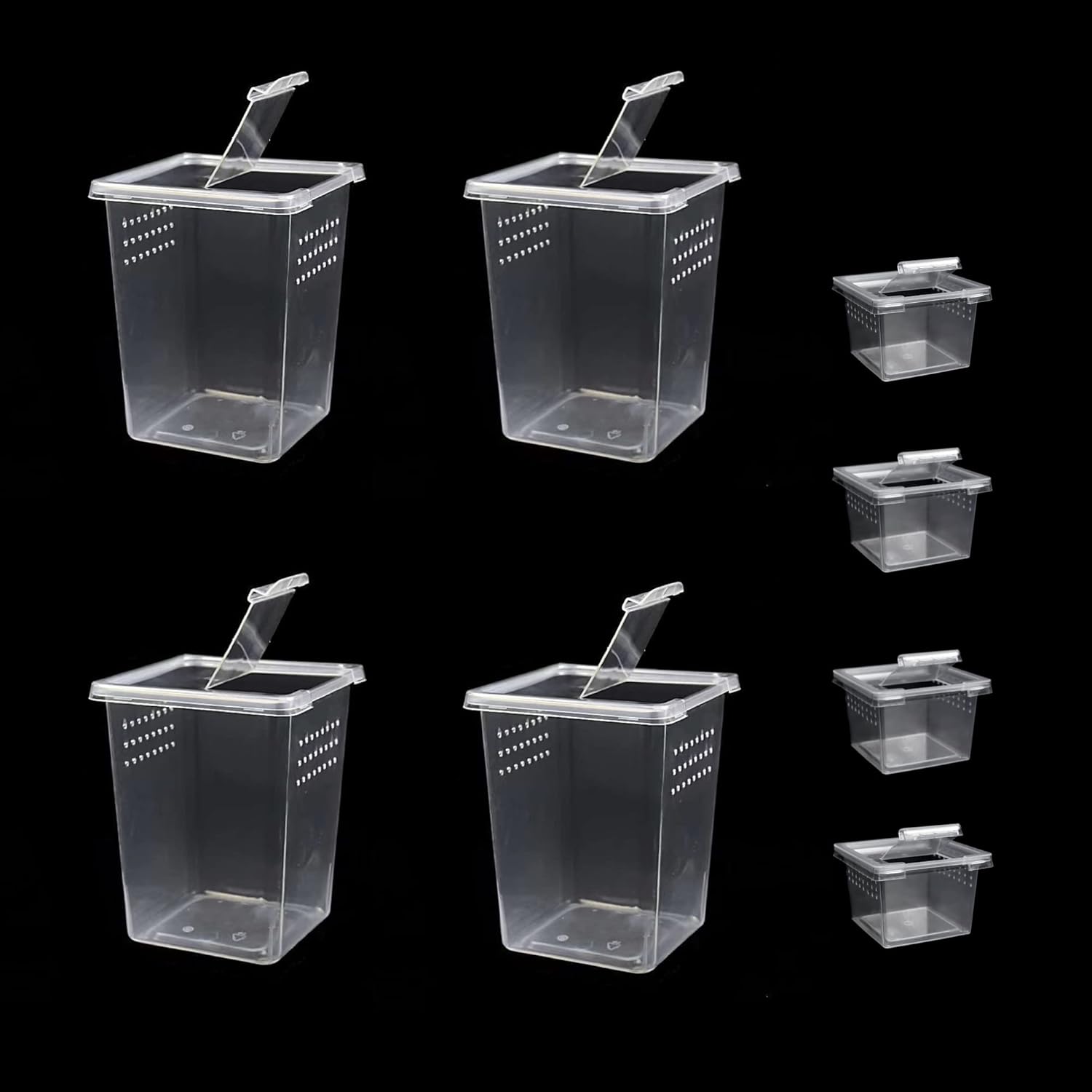 - 【insect Box Set】: package include 4 pcs high insect terrarium and 4 pcs small breeding box ,high box measure about 3.54"L x 3.54"W x 4.52"H, small box measure about 2.56"L x 2.56"W x 1.73"H,Made of quality plastic material, good transparency, sturdy , reusable, easy to clean, easy to clean, lightweight and light, suitable for pet incubation, small pet breeding box, temporary feeding or outdoor transportation and carry.