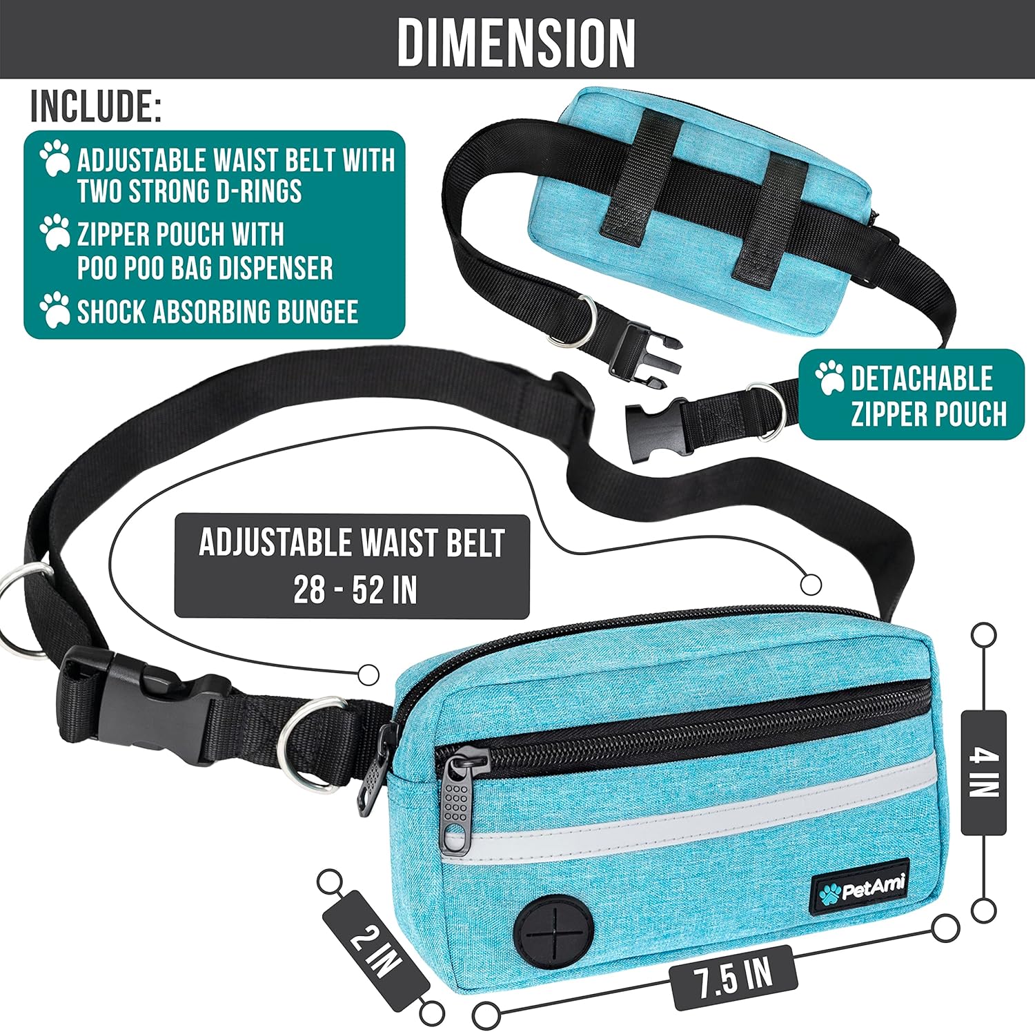 PetAmi Hands Free Dog Leash, Running Leash Belt for Walking, Jogging, Waist Zipper Pouch with Poop Bag Dispenser, Dual Padded Handles, Reflective Durable Bungee Single, Turquoise, 1