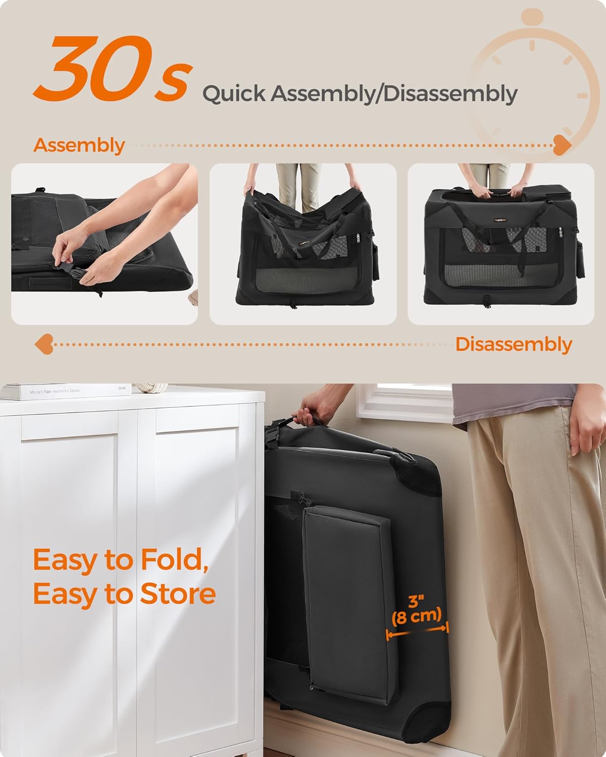 - 【QUICK ASSEMBLY & EASY FOLDING】The dog crate can be assembled in 30 seconds without tools and can be stored in the car or in the corner of your home after folding. It can be easily carried for indoor use or traveling, giving your dog a warm home anytime