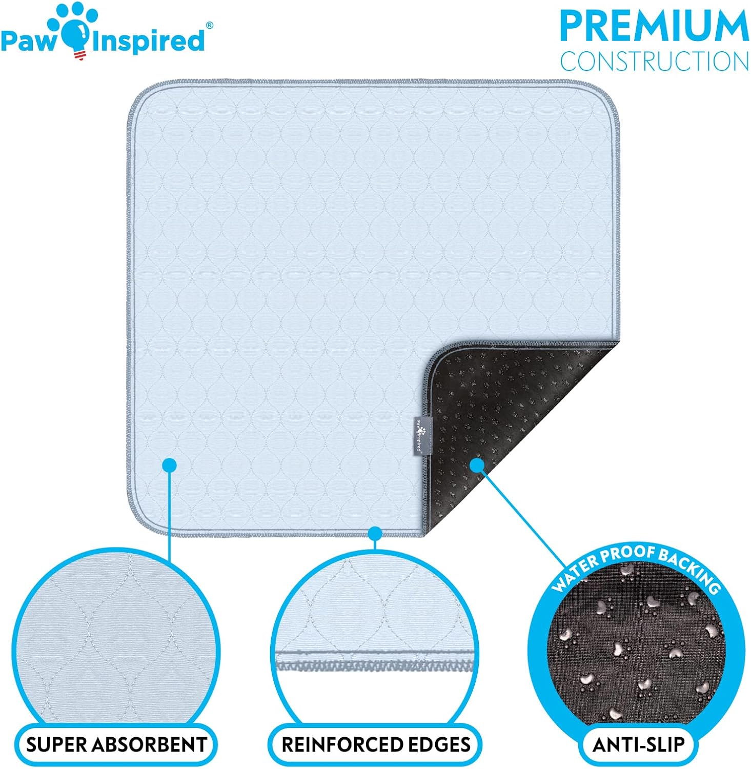 Paw Inspired Washable Pee Pads for Dogs (2 Pack), Leakproof, Non-Slip Reusable Puppy Pads for Potty Training, Whelping, Waterproof Mat (34x36 Inch, Pack of 2)