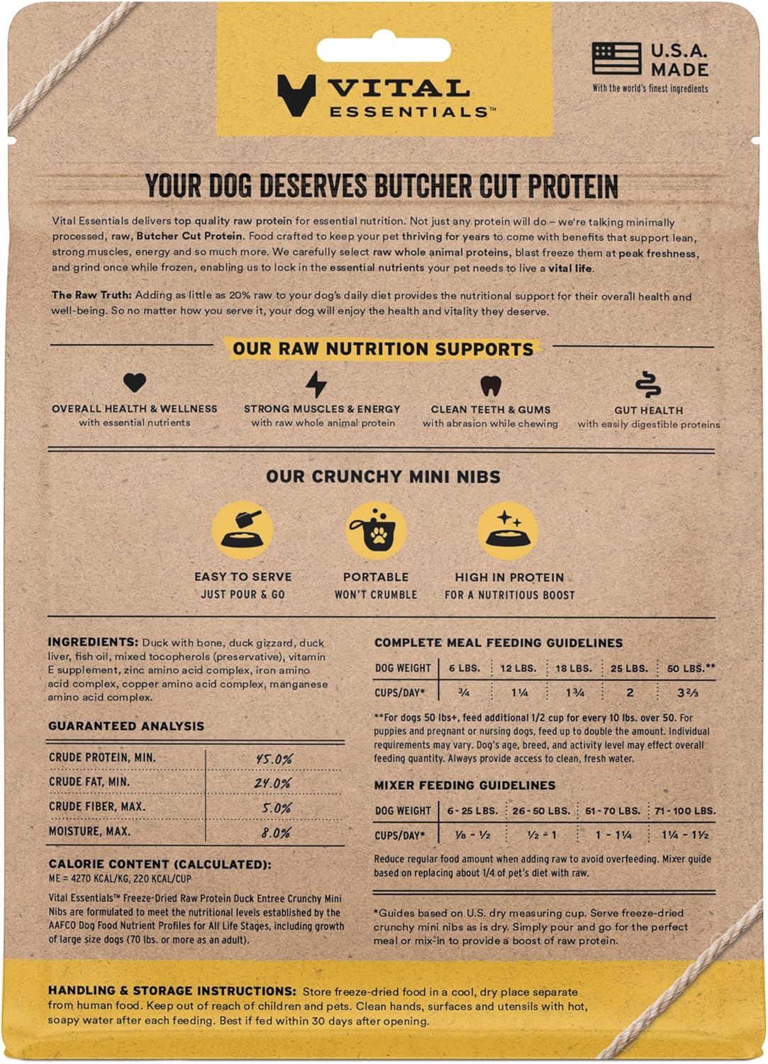 - CRUNCHY FREEZE-DRIED RAW DUCK DOG FOOD: Vital Essentials Crunchy Freeze Dried Dog Food packs more protein than industry standard into every bite to deliver the peak vitality your dog deserves, especially when compared to dehydrated dog food. This complete and balanced freeze-dried raw dog food is made with premium butcher cut duck, responsibly sourced in the EU.