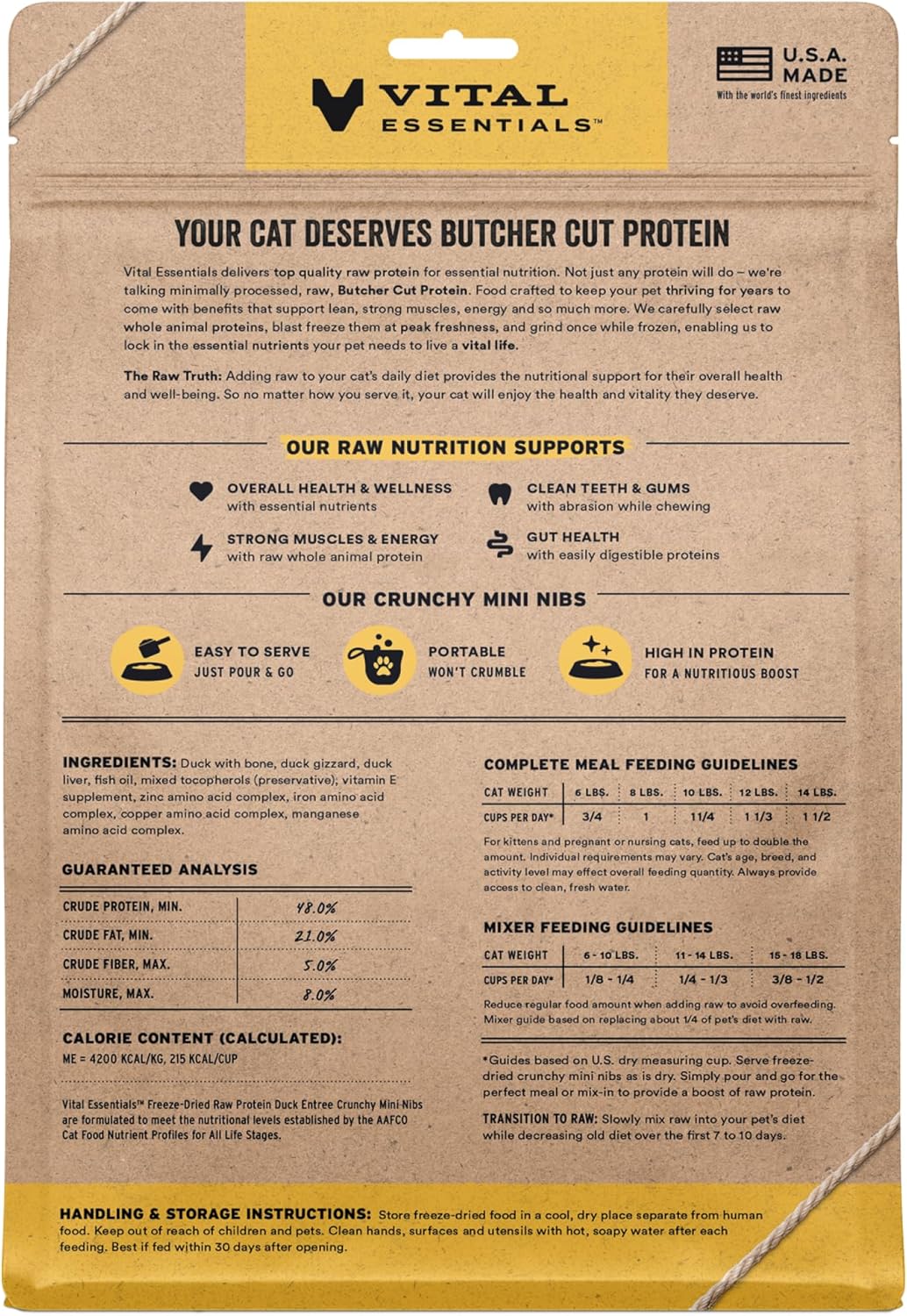 - CRUNCHY FREEZE-DRIED RAW DUCK CAT FOOD: Vital Essentials Crunchy Freeze Dried Cat Food packs more protein than industry standard into every bite to deliver the peak vitality your cat deserves, especially when compared to dehydrated cat food. This complete and balanced freeze-dried raw cat food is made with premium butcher cut duck, responsibly sourced in the EU.