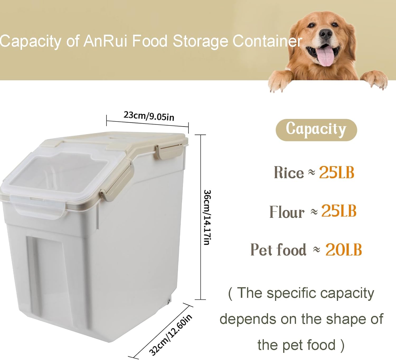 - 【Food Grade & Durable Material】 The rice storage container is made of BPA-free PP plastic and eco-friendly silicone, non-toxic and safe. Size(approx.): 32x23x36cm/ 12.6x9.05x14.17in (LxWxH). Capacity: Can hold up about 25lb flour/rice and about 20lb of pet food per container. Tip: Capacity will vary depending on the size of what you’re putting in, the capacity of the product is for reference only.