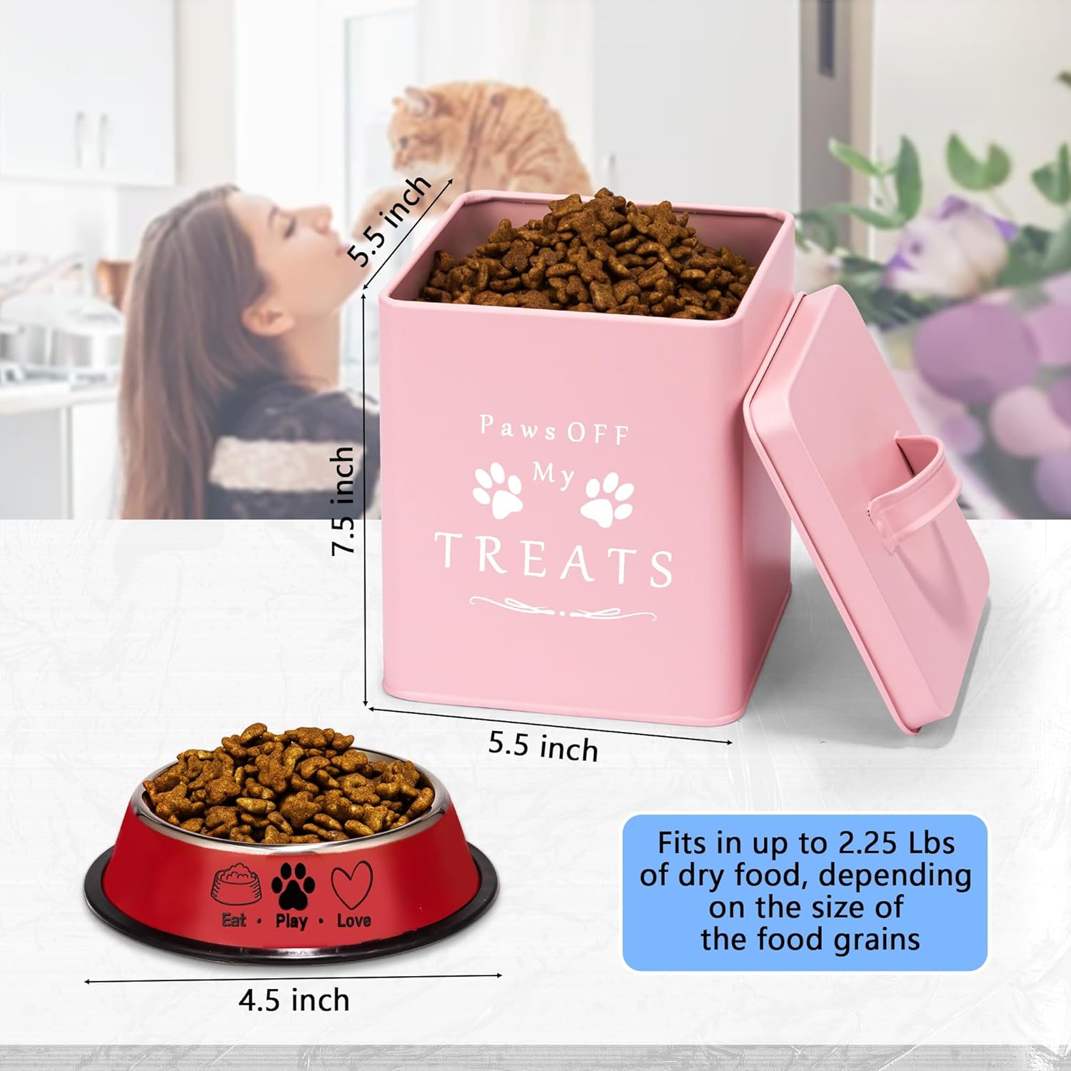- UNIQUE SET of 4 ITEMS! Inside the package, you will find: a Large Metal Cat FOOD BIN with Lateral Handles and Lid (10.2''x7.1''x6.3'', fits in 5-7 Lbs of dry food, depending on the size of the food grains) || a Metal TREATS CONTAINER with Lid (7.5''x5.5''x5.5'', fits in up to 2.25 Lbs of dry food, depending on the size of the food grains) || a FOOD SCOOP || a Glossy Red Pet FOOD BOWL for dry or wet food (4.5" diameter)