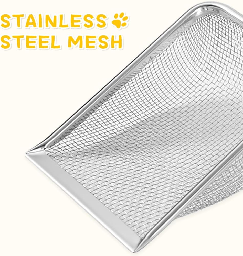 - 【High Quality Material】 The cat litter spoon is made of high-quality stainless steel mesh, the handle is made of top-grade material, which is ergonomically designed and has a superior texture. The comfortable feeling can save your time and energy in shoveling cat litter. Small holes retain cat waste and allow clean litter to return to the box. This can save a lot of cat litter, suitable for environmentalists.