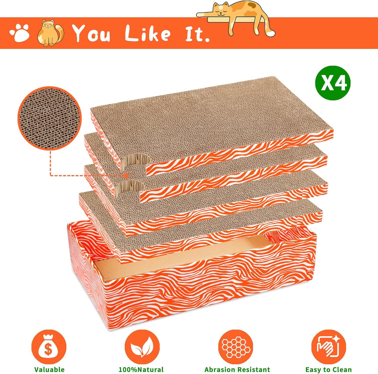 - 😻【Valueable】:Refillable, Reverable Usage and Long Lasting, kitty scratcher box including 4 pcs high density carboard , two sides of each board can be scratched, it means long lasting for monthes due to 8 sides totally can be scratched.