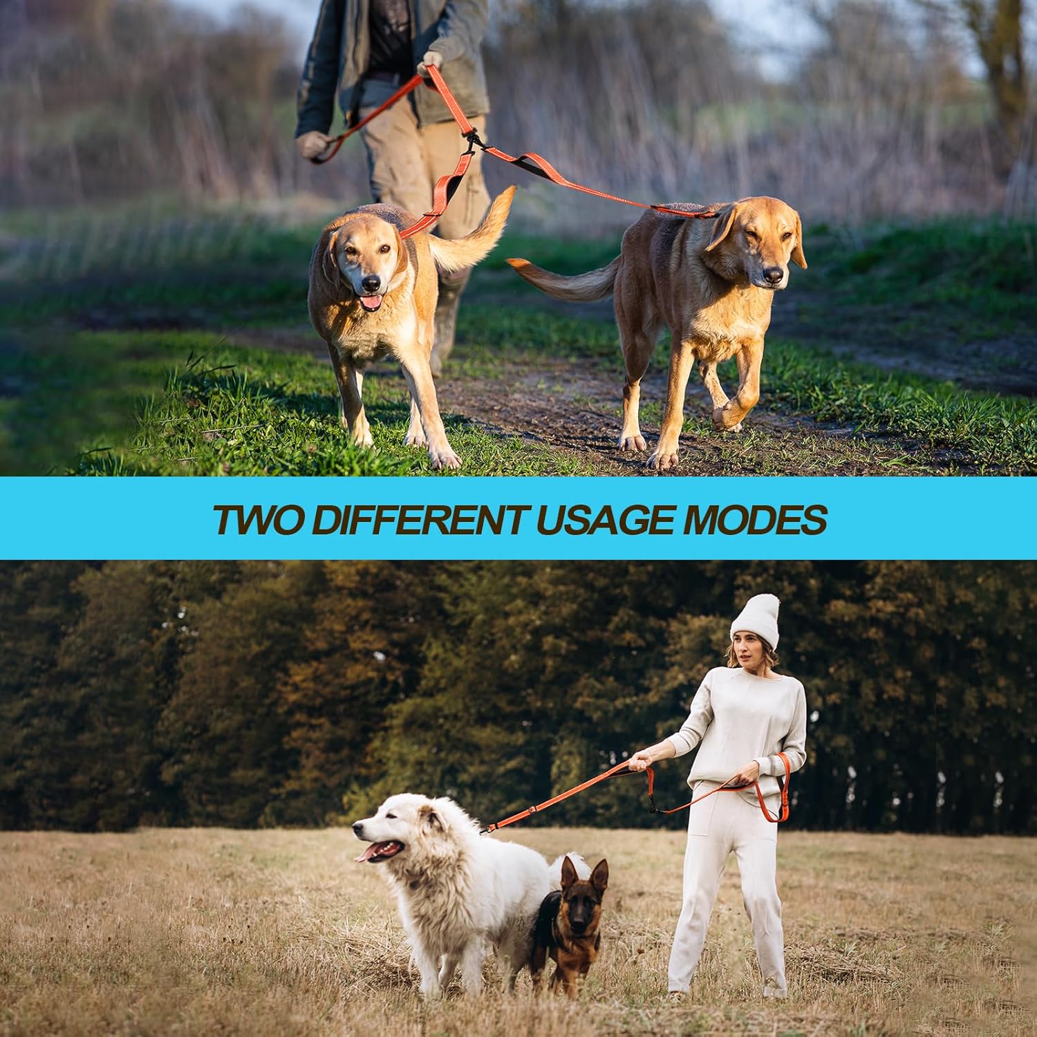 PetBonus Double Dog Leash, No Tangle Dual Leash, Reflective Walking Training Lead, 4 Comfortable Padded Handles for 2 Dogs with Collapsible Bowl and Waste Bags (Orange, Large)