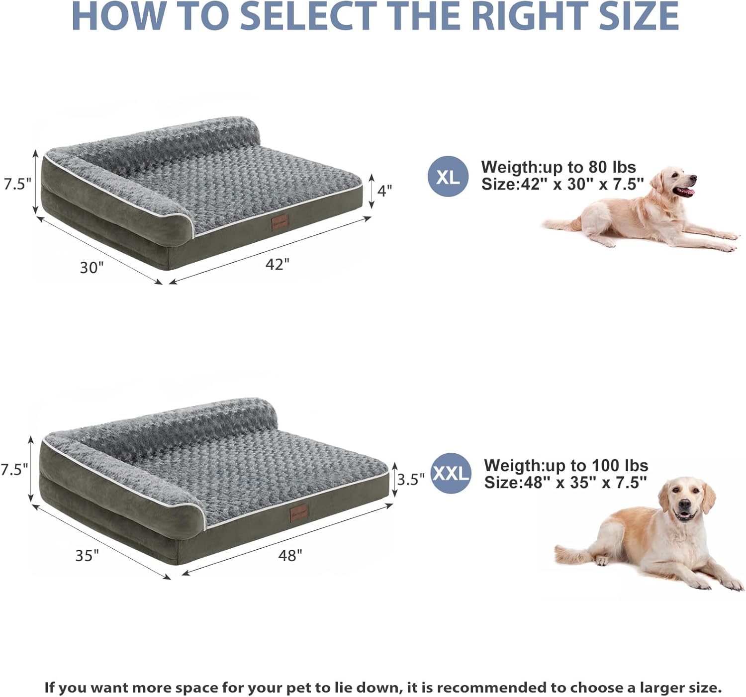 - SIZE(DOG BEDS FOR EXTRA DOGS): The dimensions of this XXL dog bed are 48“ x 35" x 7.5". XXL dog beds for extra large dogs up to 100 lbs. This orthopedic dog couch will give your pet more space and allow your friend to stretch out on the bed.
