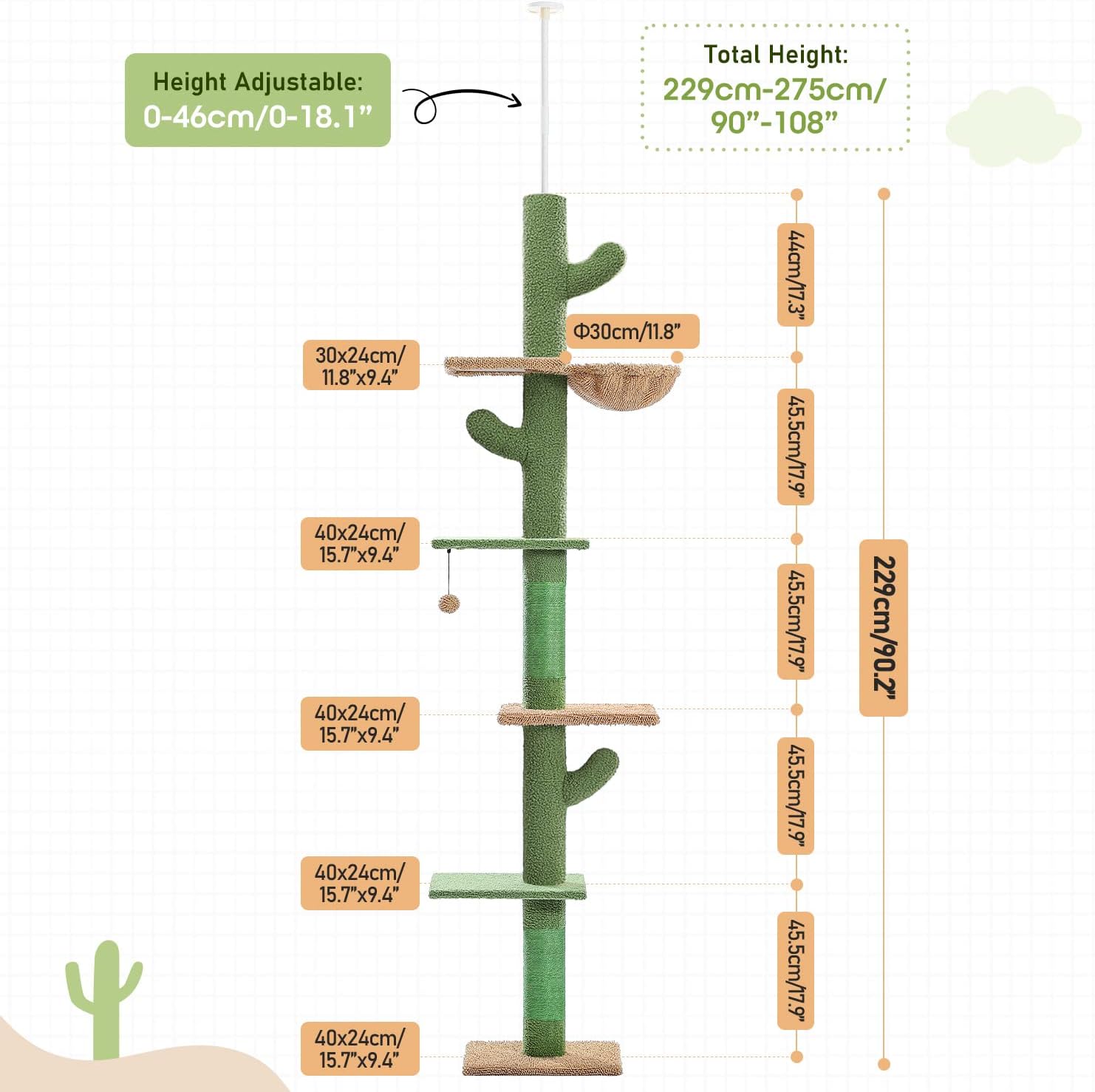 - Unique Cactus Shape: This floor to ceiling cat tower with color-saturated look, which suitable for average cats will be sure to grab full attention of your cat and also perfectly fresh your living room. Also, this multi-functional tall cat tree combines five platforms, one hammock, dangling balls and fully sisal-covered scratching post to meet indoor cat’s various needs.