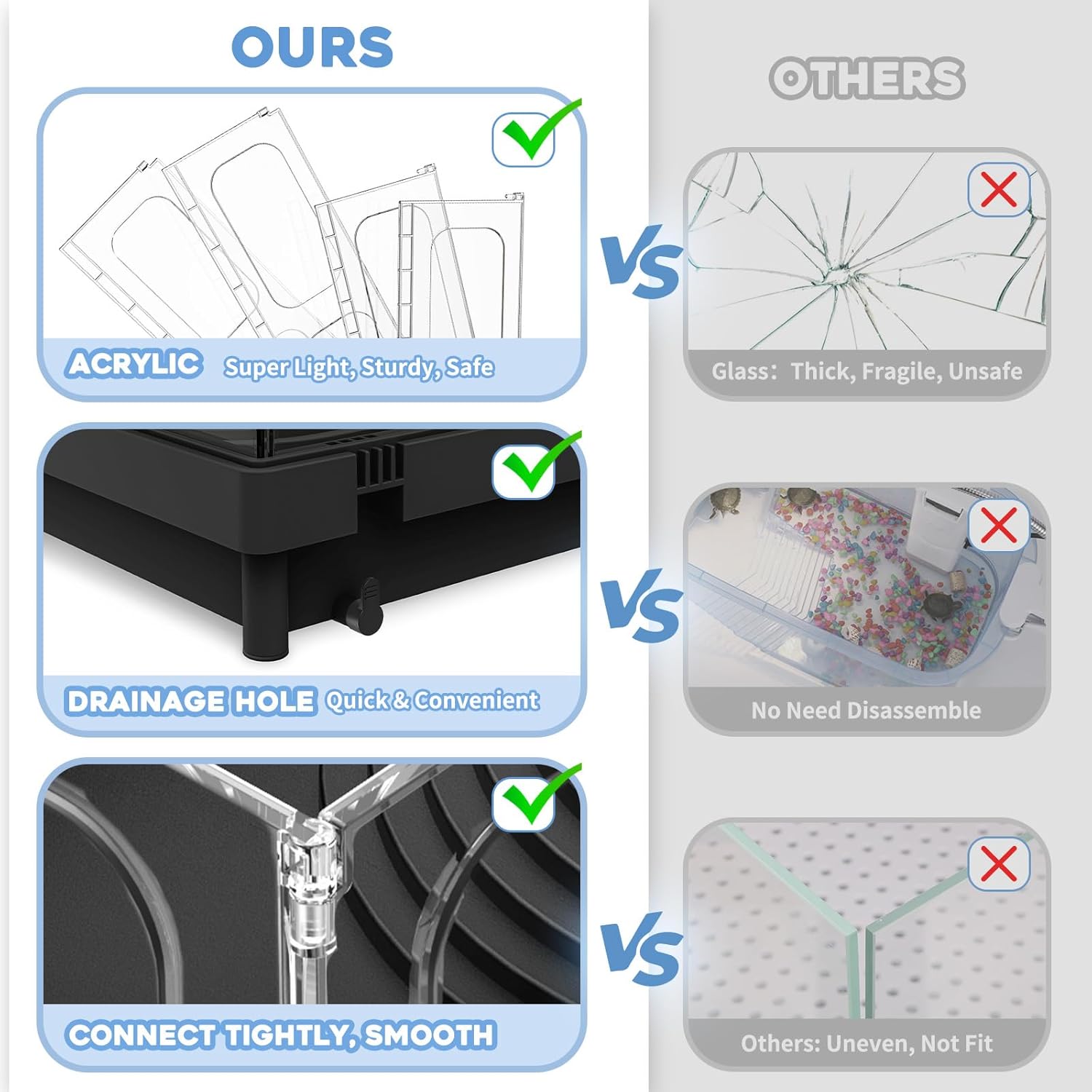 - 【TRANSPARENT DESIGN FOR BETTER VIEWING】Turtle habitat is built with acrylic panels. Acrylic panels are completely transparent. You can enjoy the inside view clearly and watch your pets easily. The panel has a thickness of only 5mm which is much lighter, safer and more durable if compared with those made of glass.