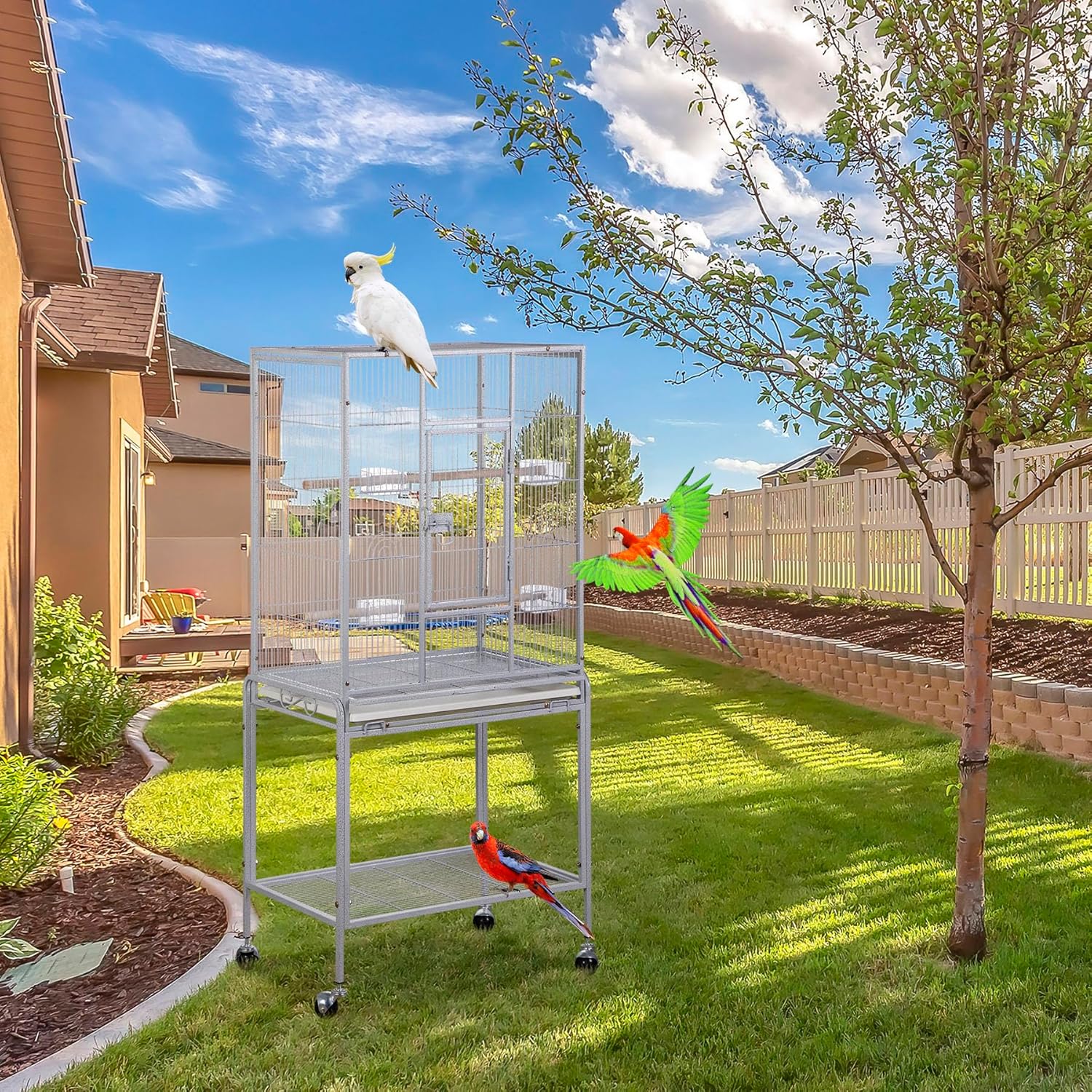 - 【Bird-Safe Construction】- This parrot cage is made of iron for durability and powder-coated finish. Four rolling casters make it easy to move around your home or take it outside for fresh air