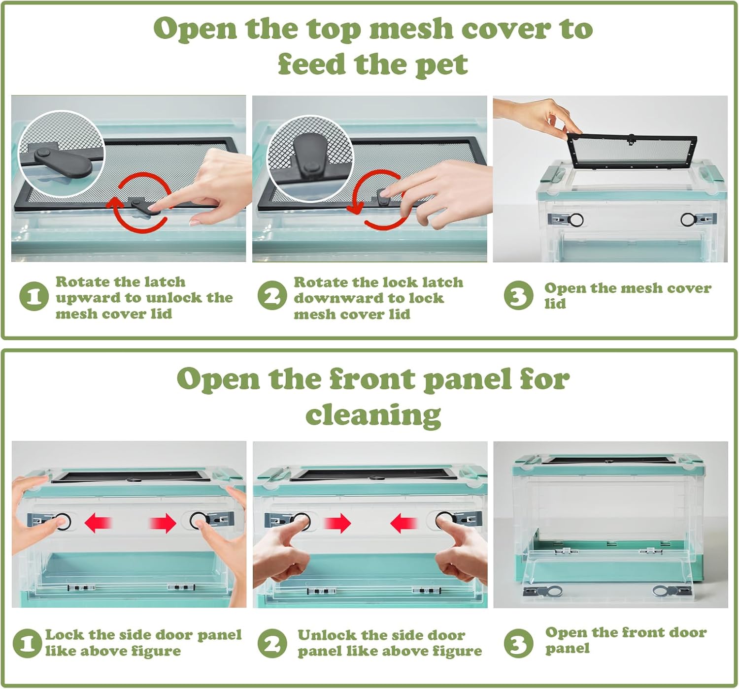 - Clever Design:Portable small snake terrarium is designed with multiple small air holes for ventilation there is a breathable panel mesh cover on the top,can be opened,closed,and disassembled,ventilation and breathability,ensuring air circulation in the internal habitat,multiple vents at the bottom and sides allowing pets to breathe fresh air. front panel can be opened or closed,convenient cleaning of pet houses,four rolling pulleys at the bottom,carrying out, and not easily broken