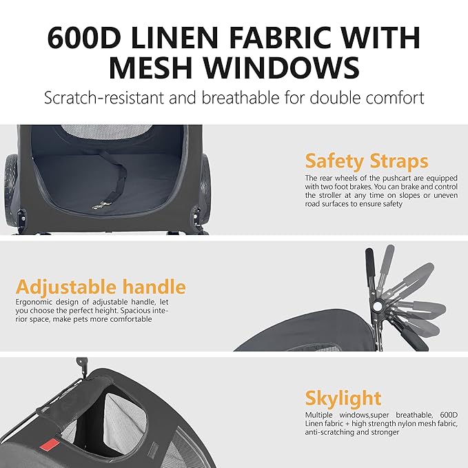 - 🛡️ 【Durable & Pet-Safe Construction】Made with a sturdy alloy steel alloy frame and rugged 600D Linen fabric, this large dog stroller is both strong and lightweight. The breathable mesh keeps your pet cool, while the 360° swivel front wheels and lockable rear wheels offer stability and control.