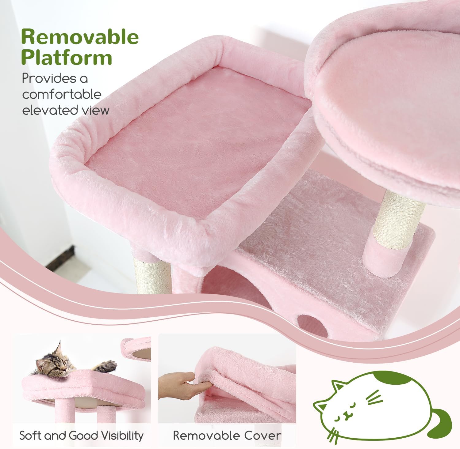 - CREATIVE SISAL ROPE: The pink cat tower addition of the small flower disc enhances the dangling effect of the sisal rope on this cat condo for indoor cats. Additionally, when lightly swayed or touched by the cat, the rope starts to create a dynamic effect similar to that of a pendulum. This dynamic and visually stimulating feature captures the curiosity and interest of cats, increasing playfulness and interaction