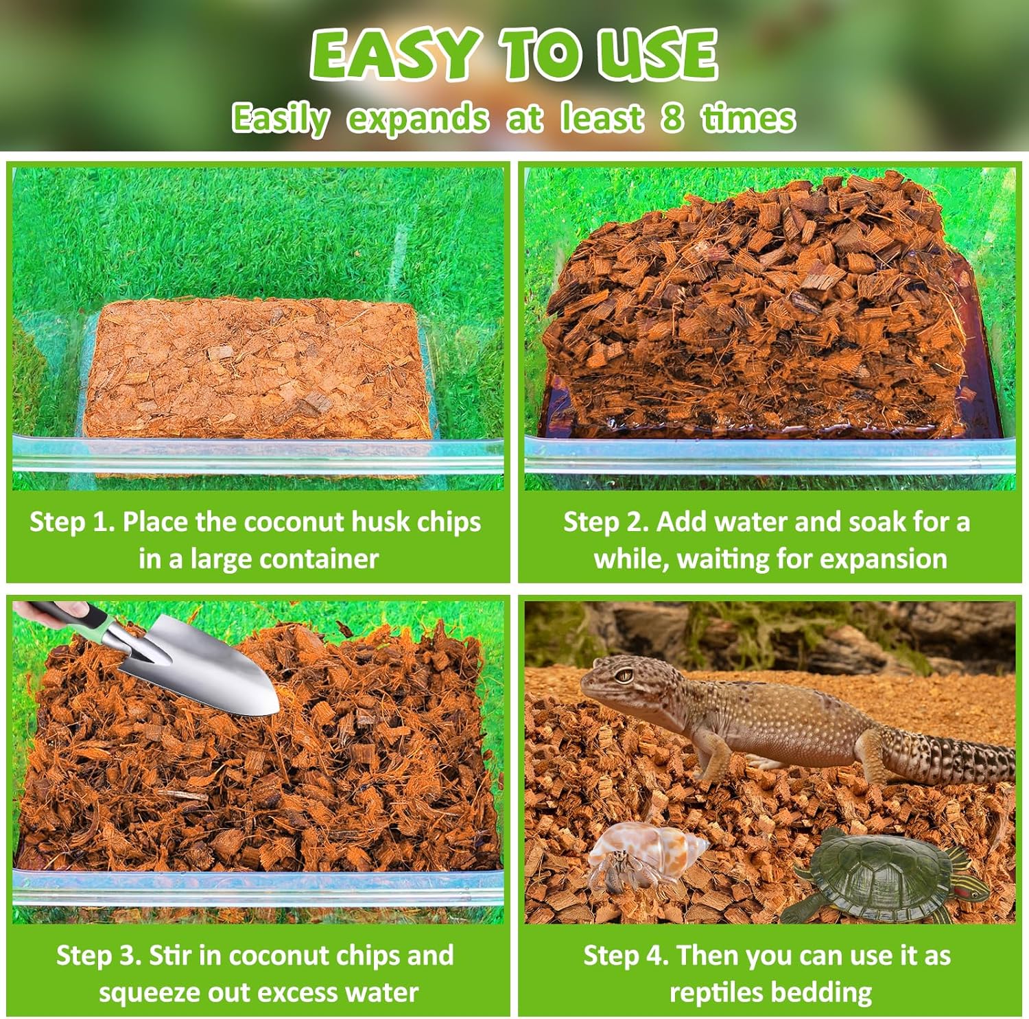 - Versatile Substrate: Coconut husk chips are great for reptiles, amphibians and invertebrates, provide them with better support bedding and are an essential addition to ball python tank accessories and hermit crab supplies; It can also be used as a garden mulch, soil amendment and hydroponic medium, which is beneficial to plant growth