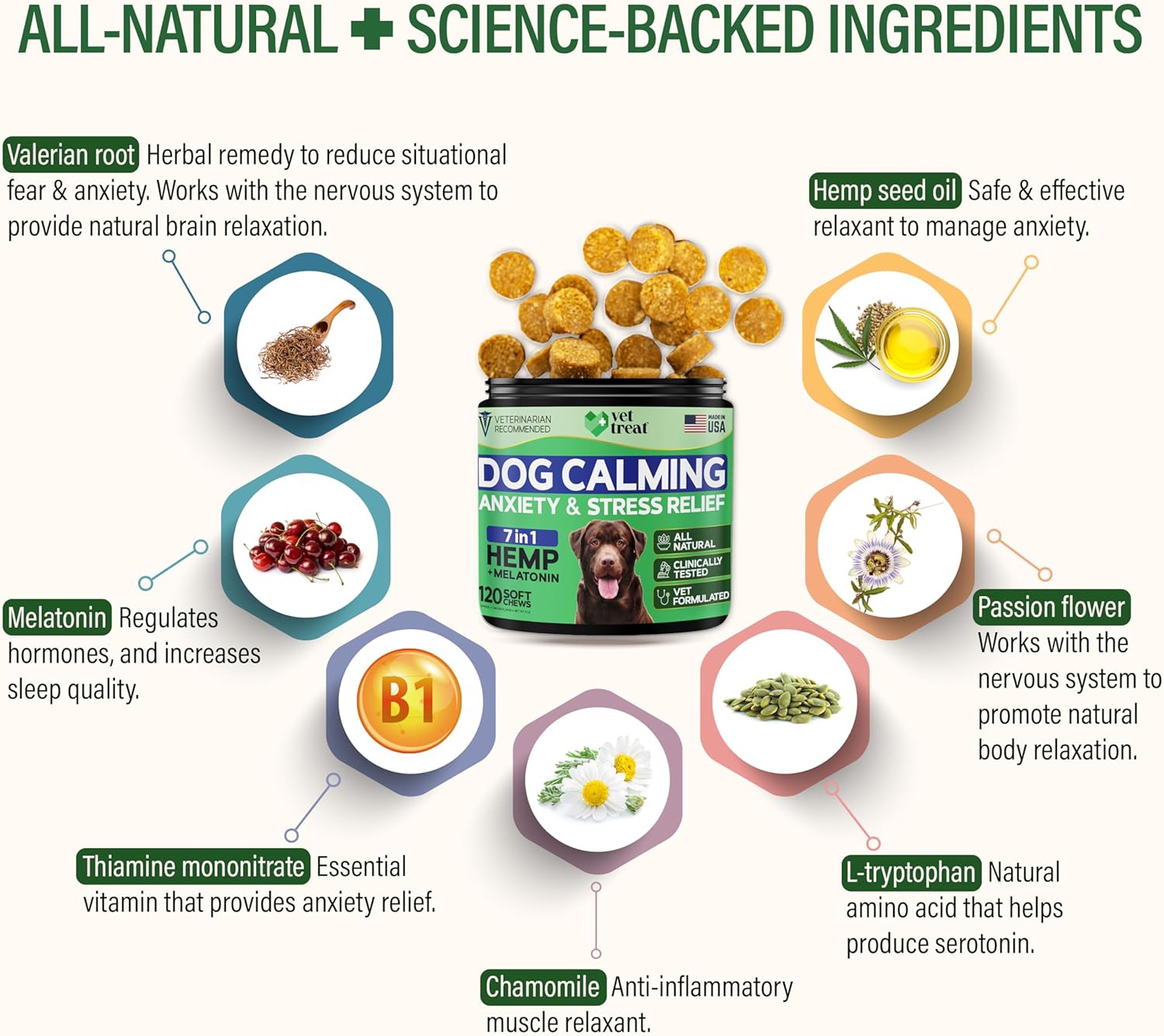 - Premium Natural Ingredients – Vet Formulated: Formulated by veterinarians, these dog calming chews - anxiety relief treats feature natural herbs and hemp for dogs to reduce anxiety and promote well-being – with no artificial fillers, corn, or soy.