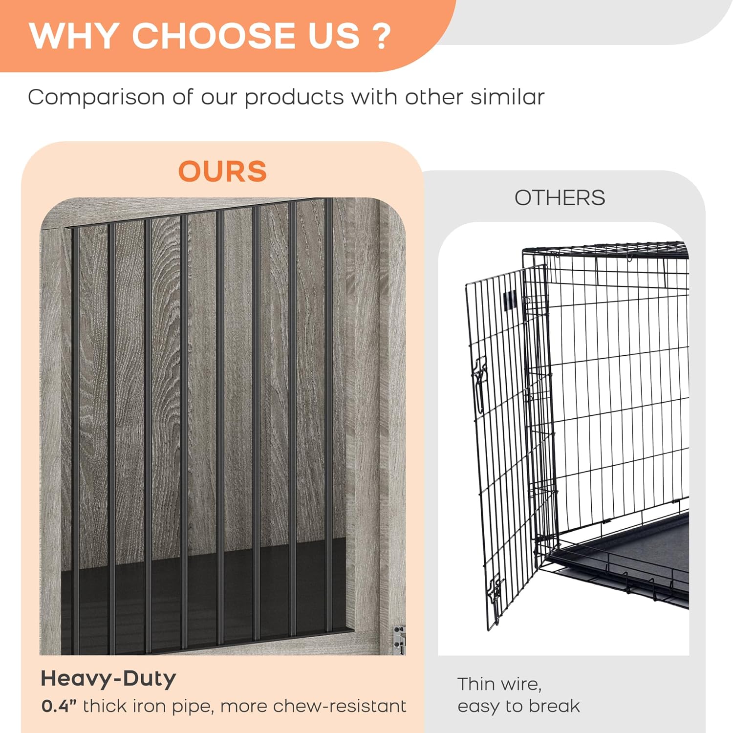 Large Dog Crate with Sliding Door, Furniture-Style Wooden Indoor Kennel, Integrated Side Table & Drawer, Secure Lock, 360° Rotating Bowl, Modern Pet House - Ideal for Home Decor (Grey)