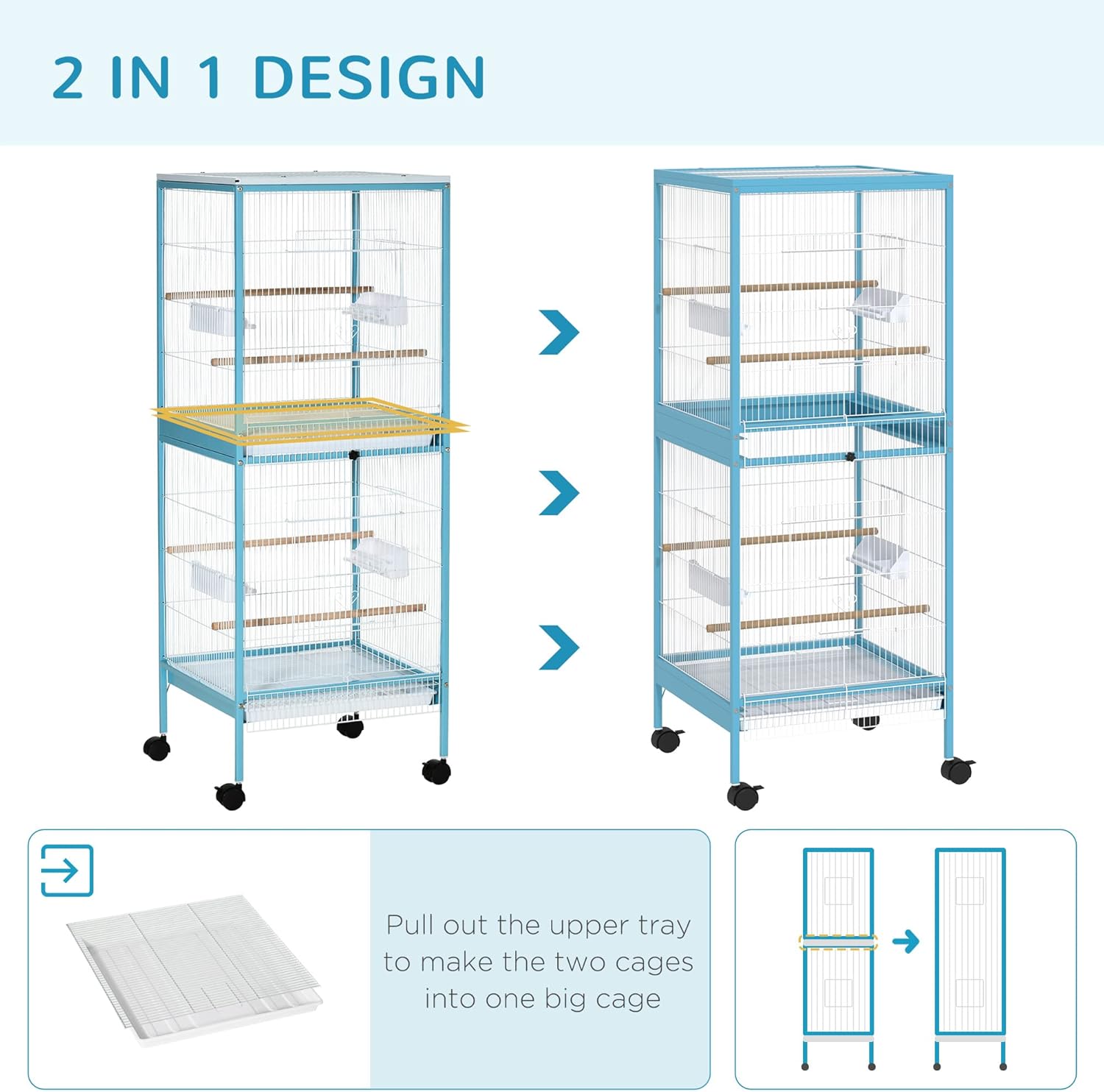 - Large Space: Birds need space not just in height but in width, and 1.7 ft. distance from left to right gives this large bird aviary a grand size in interior space, ensuring comfortable pets. The width lets them fully flap and extend their wings with extra additional space. Each cage contains two wooden perches and two plastic food containers for multiple animals. Pull out the upper tray to make the two cages into a big cage.