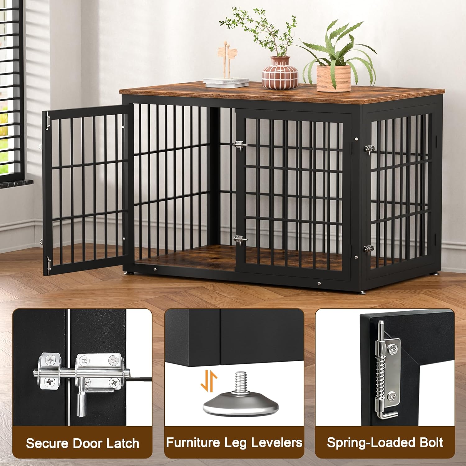 - 【Safety Guaranteed】 The metal coating and board surface are non-toxic if the dog chewed or licked. The sliding latches on the front door and side door prevent the high anxiety dogs from opening the door and escaping.