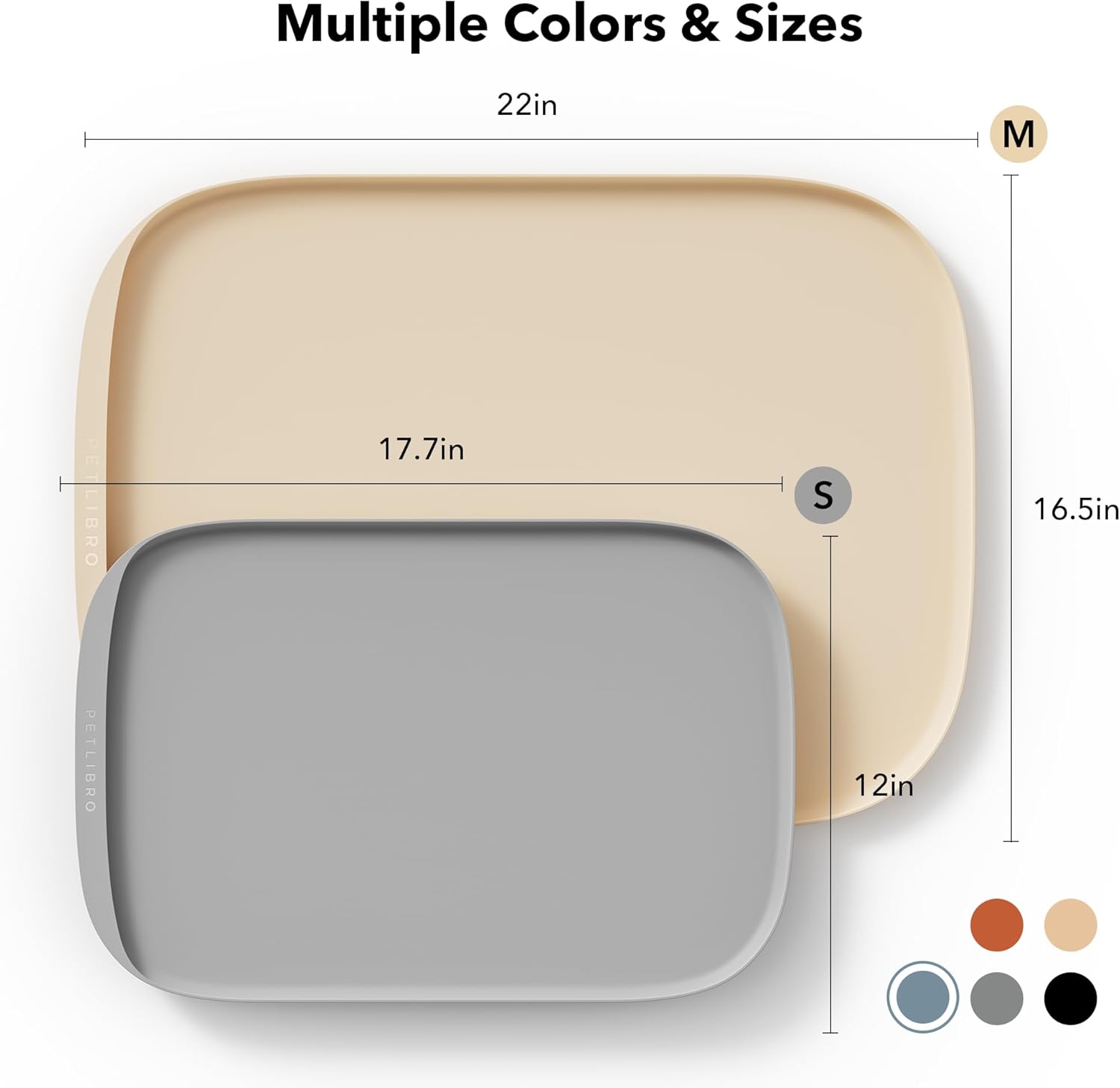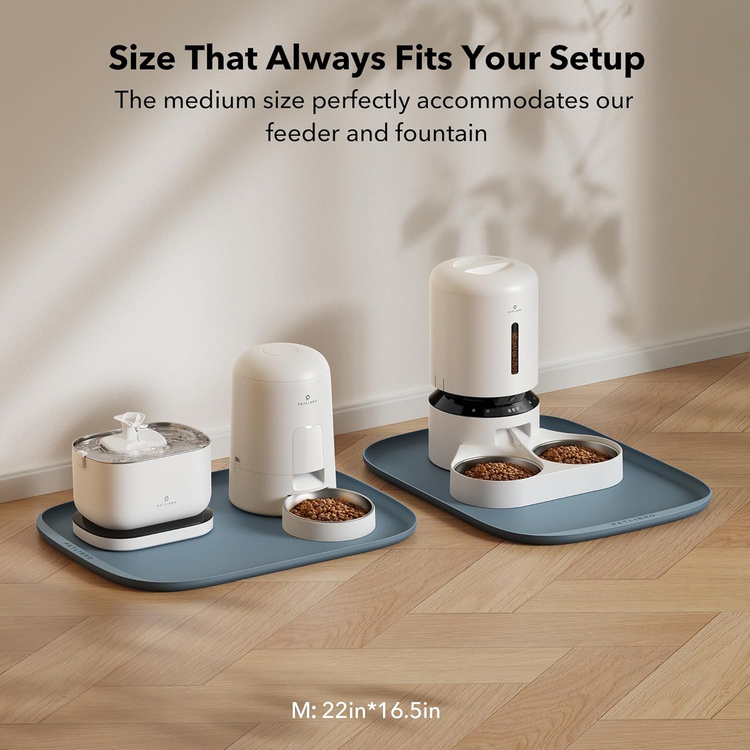 - A Perfect Fit For Every Pet And Bowl: With a range of sizes and colors to choose from, the Cove food mat is a versatile addition to any pet feeding station. The small mat measures 17.7 × 12 in, while the medium option measures 22 × 16.5 in. Not only do they fit perfectly with the PETLIBRO range of smart feeders and fountains, but they're compatible with various bowls and accessories too.
