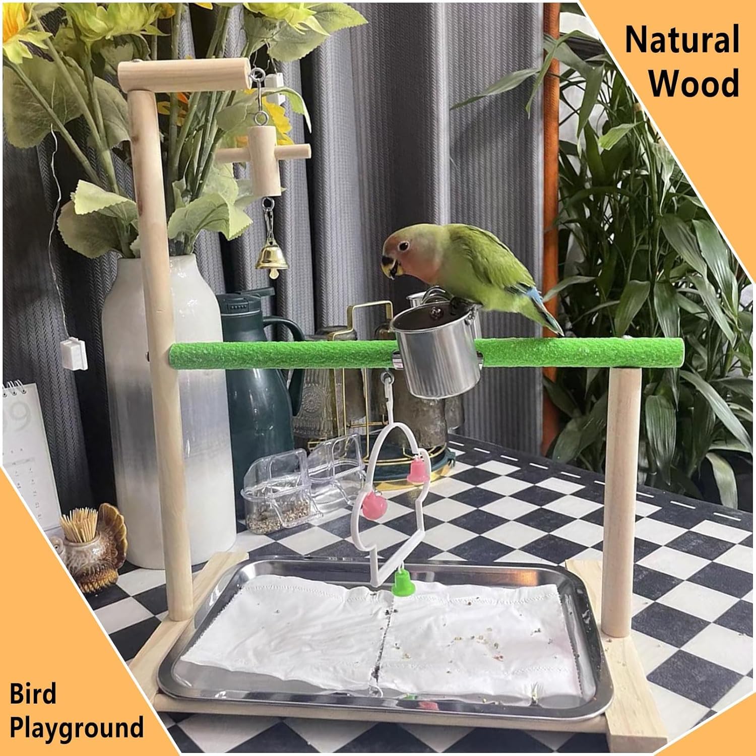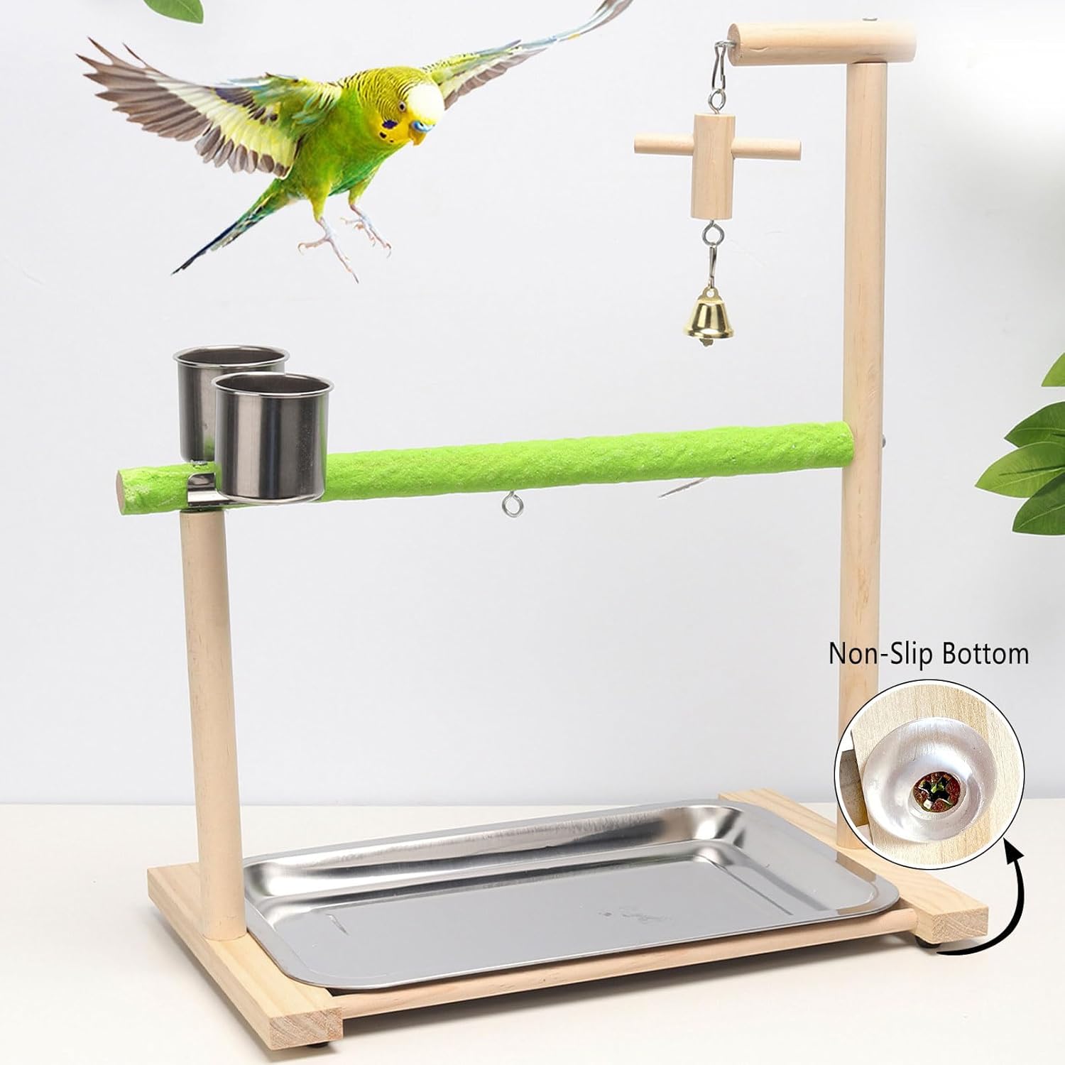 - 【Thoughtful and Practical Design】: The bird play stand features two stainless steel cups for your bird to enjoy food and water after playtime. Additionally, the stainless steel tray at the bottom of the bird play stand provides a convenient and easy-to-clean surface, ensuring a clean and entertaining environment for your bird.