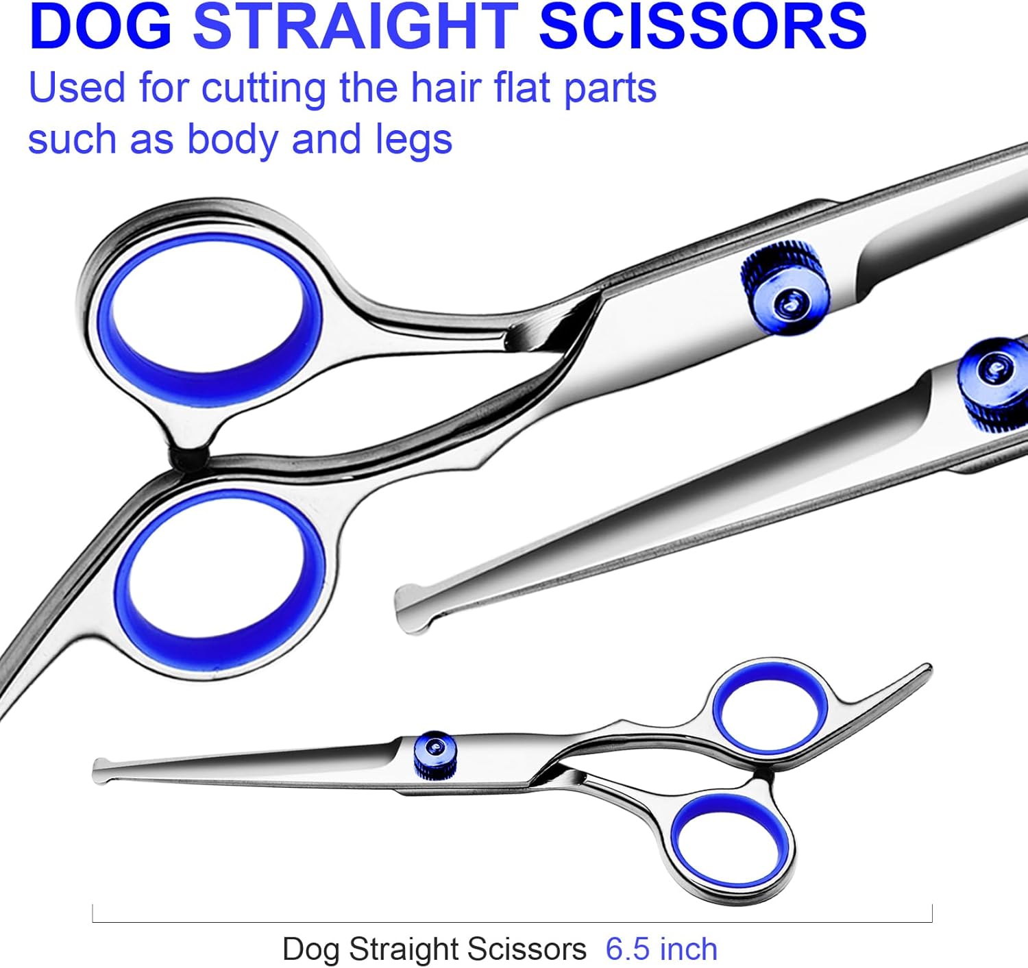 - Practical dog scissors kit: Dog grooming scissors kit includes 6.5-inch thinning shears, 6.5-inch curved scissors, 6.5-inch straight scissors, grooming comb, cleaning cloth and black case