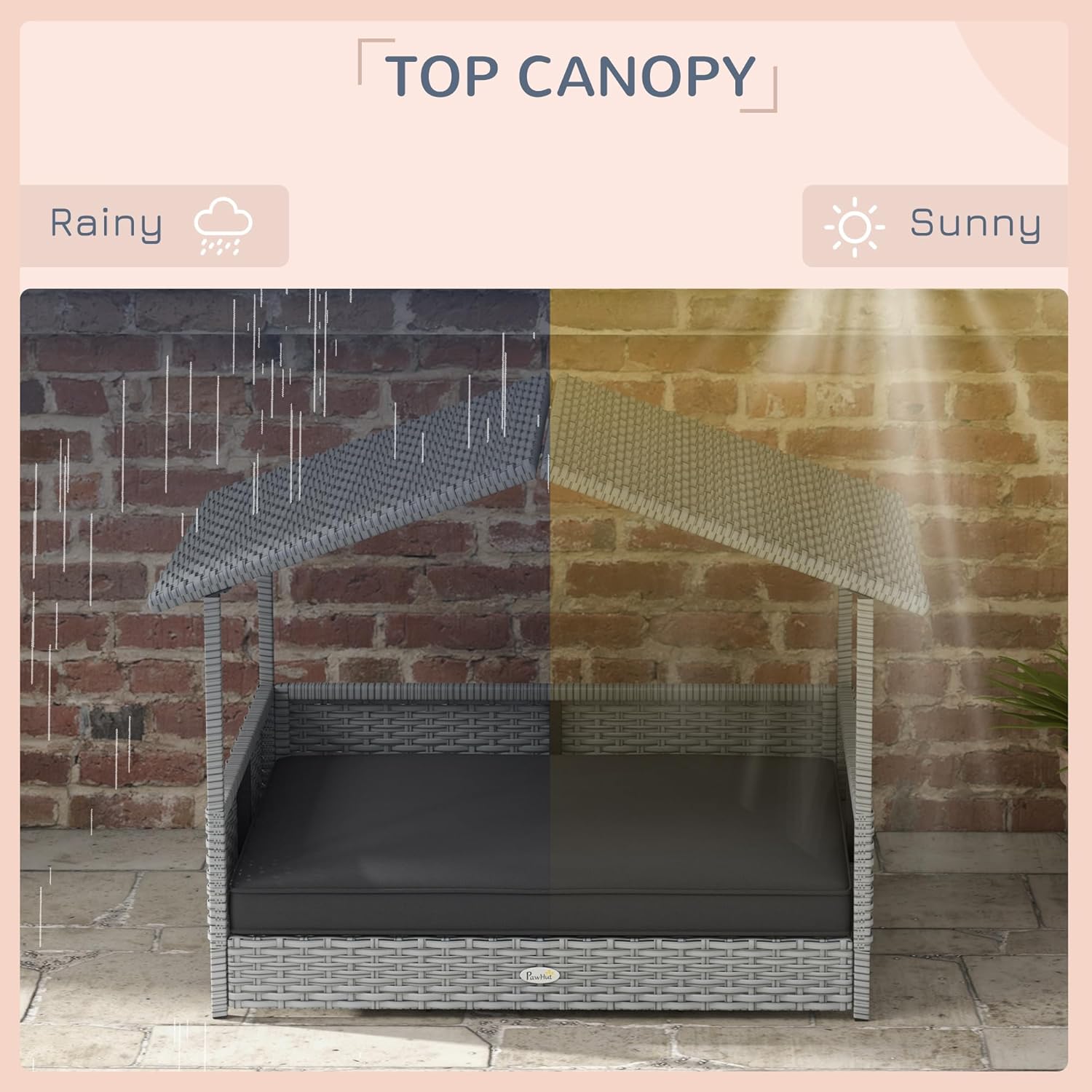 PawHut Wicker Dog House Outdoor with Canopy, Rattan Dog Bed with Water-Resistant Cushion, Raised Dog Bed for Small, Medium Dogs up to 66 lbs, 19.75" in Length, Silver Wicker, Gray Cushion