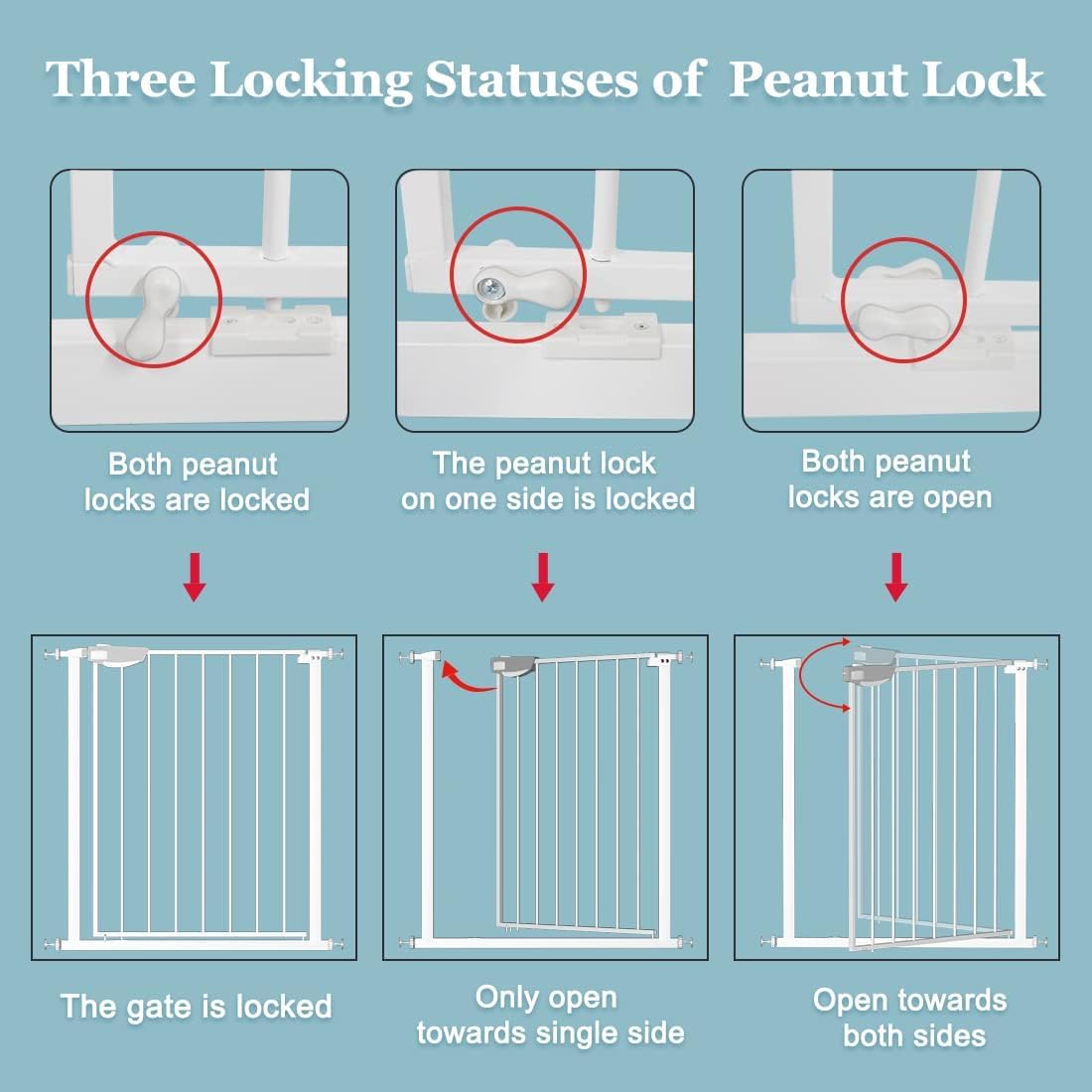 - 【Triple Lock System】Babies will be blocked by the safety baby gate since we designed a triple locking system that is easy for adults to open while tough for babies. At the top of the gate, there are two buttons and each of them controls one lock. To open the gate, you should press both buttons simultaneously. And at the bottom of the gate, there are two peanut locks to control the opening direction and locking. With these triple locks, curious babies will be well protected by our metal gate.