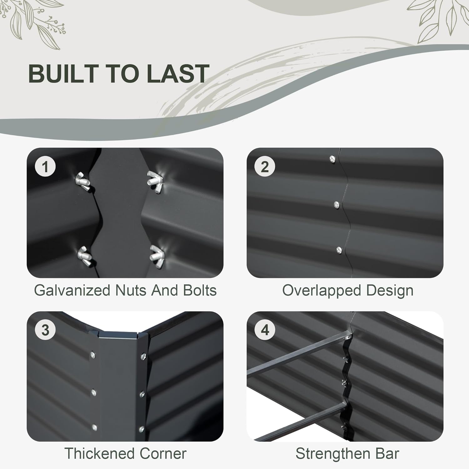 - Thicker Material: Made of thick galvanized steel plate with eco-friendly coating, rust-proof and durable. The 0.8 mm thickness, reaching 1.8 mm in the thickest part, ensures long-lasting raised garden beds' outdoor aesthetics.