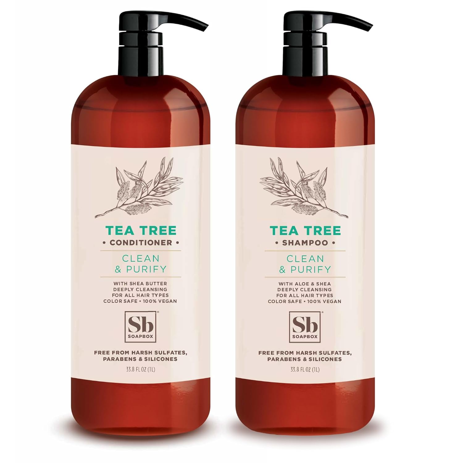 Soapbox Tea Tree Shampoo and Conditioner Set, Scalp Balancing with Tea Tree Oil, Jojoba Oil, Aloe and Shea Butter to Clean and Purify for All Hair Types, 1 Liter Each (Pack of 2)