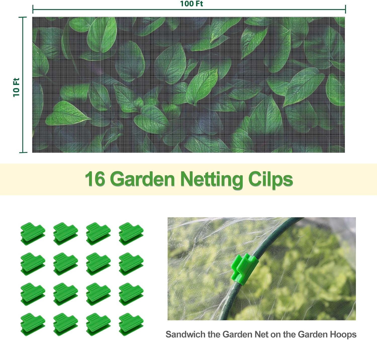 - [ Garden Plant Protector ] 10X100 feet large garden netting ultra-fine net, large enough to cover a variety of plants. And comes with 16 garden clips for you to clip the net on hoops.