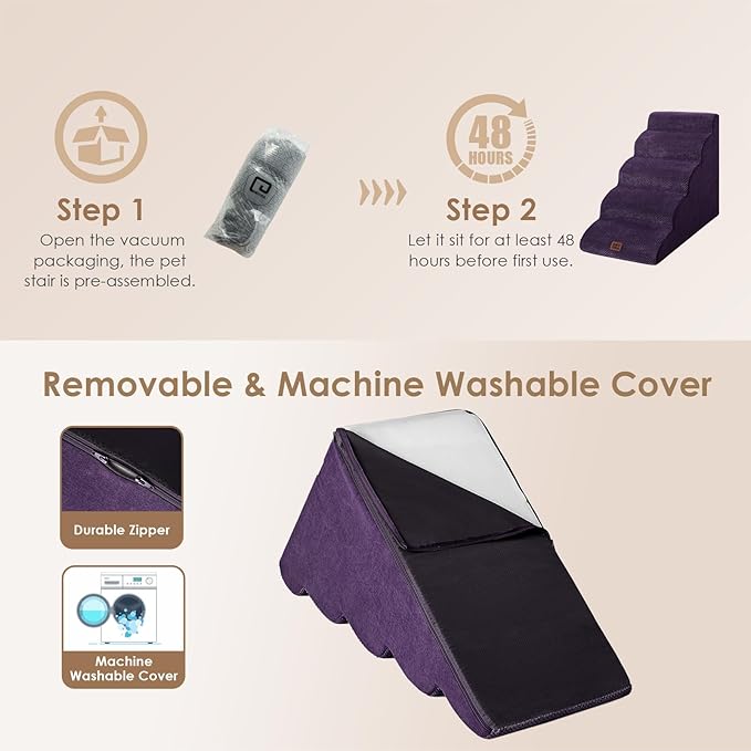 - SPECIFIC AND STEADY DESIGN - 33D density of pure foam make this stair more steady when your pets walk on. The dog bed stairs can provide strong support for pets in the walking process. Low angle slope design can better protect your pet's joints.