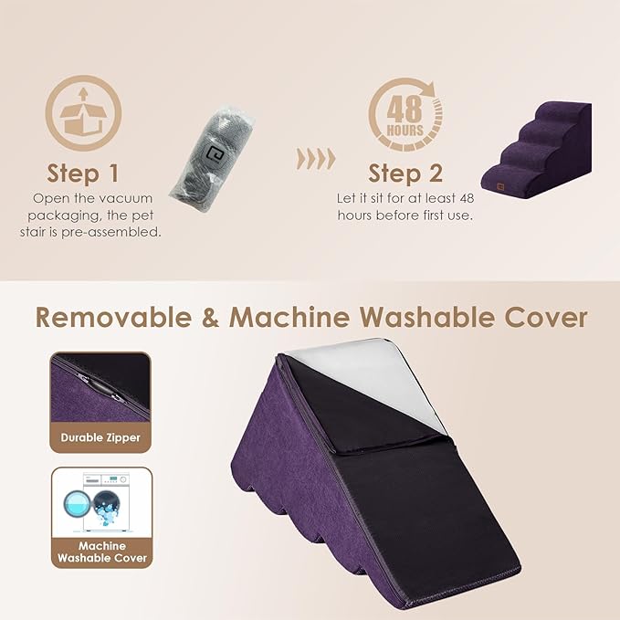 - SPECIFIC AND STEADY DESIGN - 33D density of pure foam make this stair more steady when your pets walk on. The dog bed stairs can provide strong support for pets in the walking process. Low angle slope design can better protect your pet's joints.