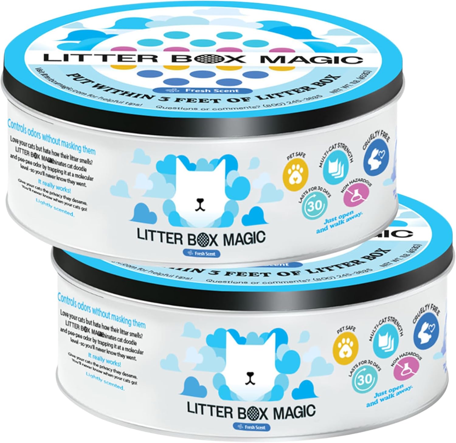 - MAXIMUM STRENGTH & LONG-LASTING; Up to 30 days of odor control – This cat box deodorizer pro-grade strength formula delivers powerful litter box odor control for up to 30 days, even in multi-cat households. Twist open the cat litter scent deodorizer jar and let it go to work—perfect for bathrooms, closets, enclosed basements, and small, poorly ventilated areas. With its continuous odor-fighting power, enjoy up to 30 days of effective odor elimination.
