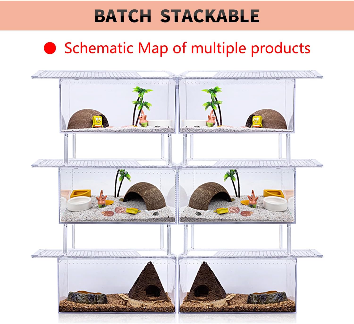 - 🌟【Batch Stackable】 Our breeding tank is all-round transparent, it's convenient to observe your slithery friends in the box and feed them in time. Its biggest highlight is that it can be stacked with multiples of the same reptile tank using additional columns(4pcs), which is a good choice for raising or breeding reptiles. Sturdy and space-saving, easy to feed and change water.please see the picture on the page.