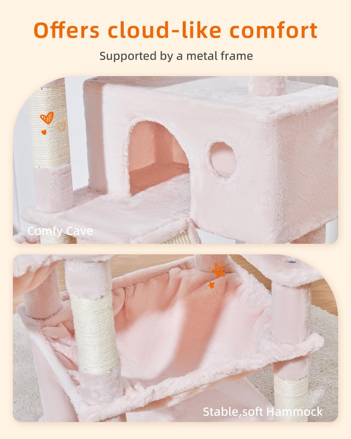 Taoqimiao Cat Tree 57.5-Inch, Cat Tower for Indoor Cats Large Adult, Extra Large Cat Condo, 8 Sisal Scratching Posts, Metal Frame Cozy Hammock, Durable Scratch Board, 2 Top Perches, Jelly Pink MS026P